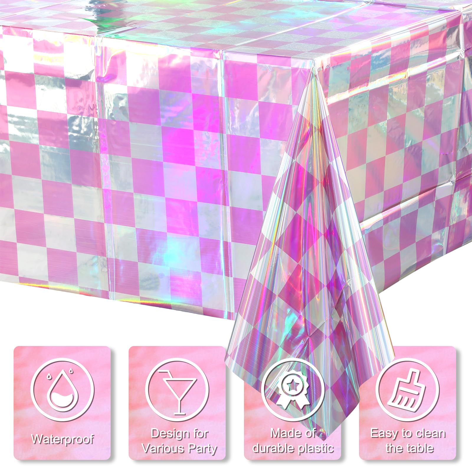 Waterproof and Protect Table: The iridescent pink checkered disposable tablecloth is made of plastic, sturdy, waterproof, oil-proof, not easy to break and fade, can be applied for a long time, is good for every party or event, protect and decorate your table.