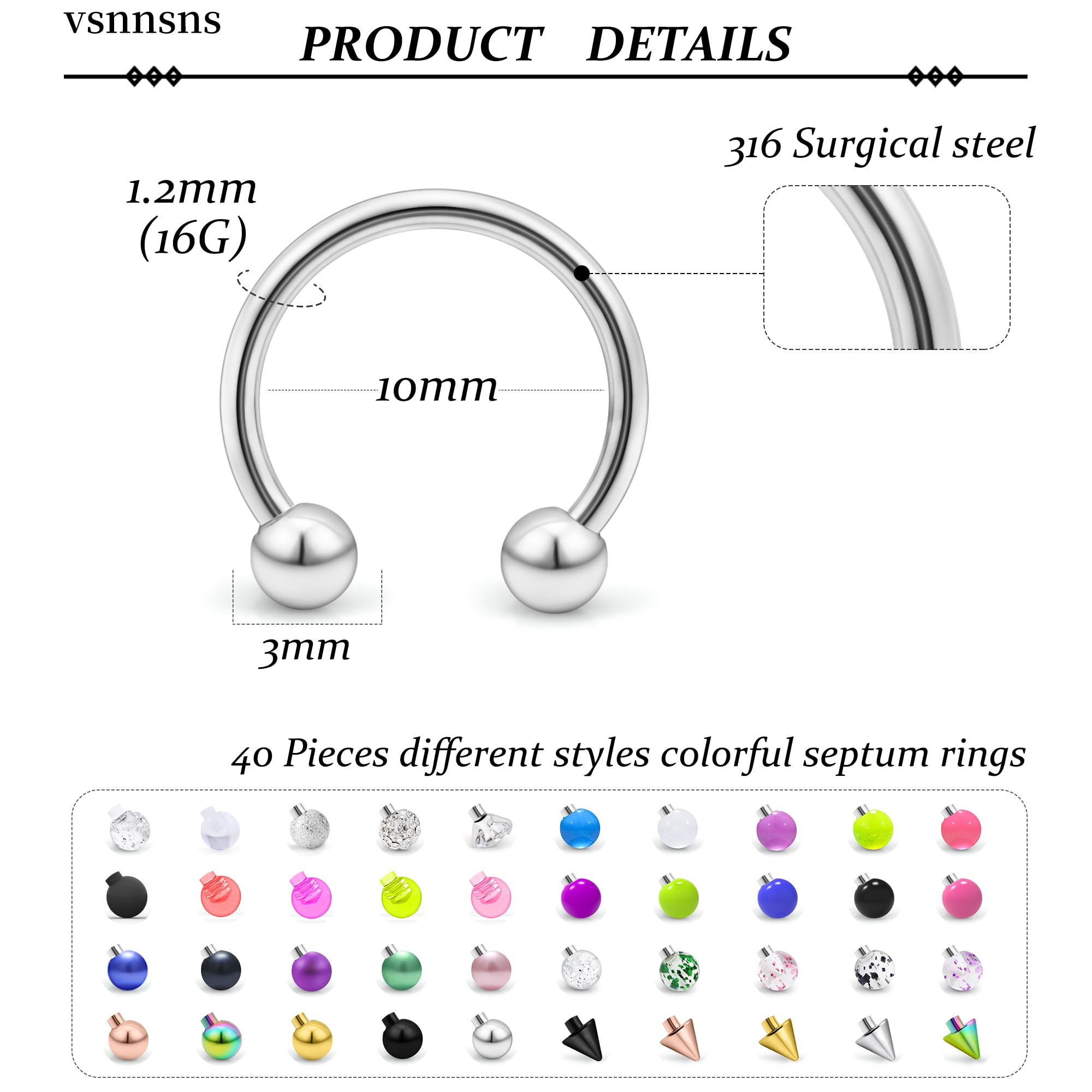 [PRODUCT SIZE]: Septum Rings Thickness: 16G (1.2mm), Horseshoe Earrings Inner Diameter: 10mm(3/8inch), Ball Size: 3mm; Color: Mix Color .