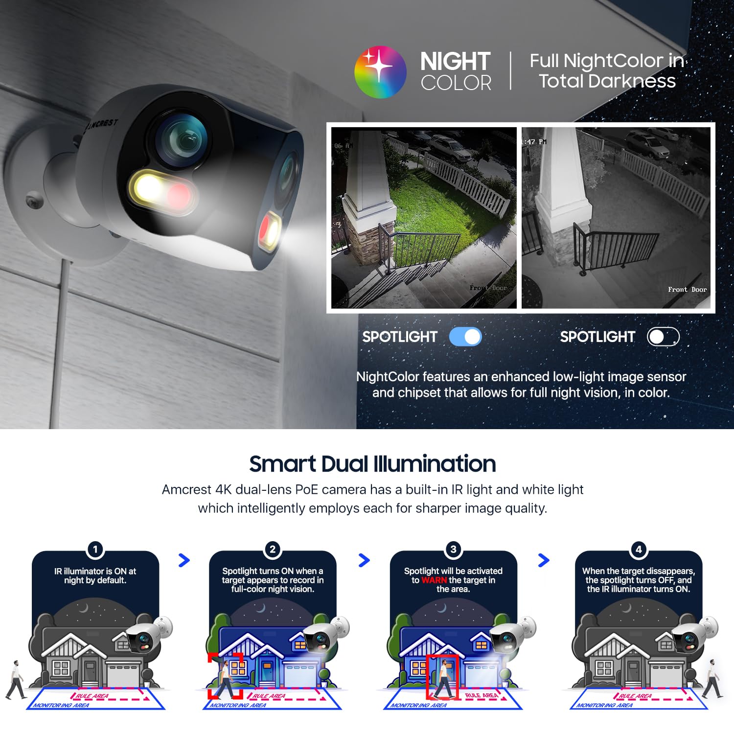 AI FEATURES – 2 x 4MP Bullet AI PoE Camera features IVS perimeter protection, face detection, heat map, as well as advanced smart motion detection, which allows detection of only humans or vehicles to reduce false alerts. Offers 2 x 4MP lenses with resolution @ 15fps video with a super-wide 180° viewing angle. A PoE injector or switch is required; not included. Compatible with most mainstream web browsers however some advanced features may require a .exe plugin.