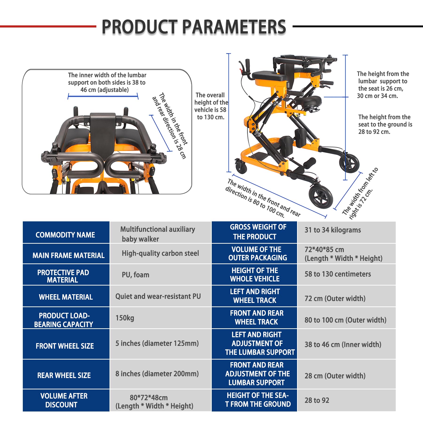 Multi-Functional Training: Supports standing, walking, and push cart training to aid in physical recovery for stroke victims, hemiplegia patients, and those with brain injuries. Adjustable Dimensions: Frame height: 58–130 cm Seat height: 28–92 cm Wheelbase width: 80–100 cm Suitable for adults with orthopedic needs, cerebral palsy, or amputated legs. Safety First: Anti-forward, backward, and side-tilt tested. Load-bearing capacity: 150 kg. Stable 72 cm wheelbase for easy maneuverability, ideal for seniors and those relearning how to walk. User-Friendly Design: Stepless height adjustment with dual air rods. Quick-fold mechanism for easy storage and transport. Soft, scrubbable PU foam padding for hygiene and comfort. Walker tray and wheels included for added convenience. Durable Construction: High-quality carbon steel frame (30×60 mm, 1.2 mm thickness). Quiet, wear-resistant PU wheels (5-inch front, 8-inch rear). Overall weight: 31–34 kg. Ideal For Rehabilitation centers and hospitals. Homecare for patients recovering from injuries or surgeries. Elderly individuals requiring mobility assistance. Users with hemiplegia, cerebral palsy, or amputated legs. Why Choose This Product? Versatility: Supports multiple rehabilitation stages in one device. Customization: Adjustable dimensions cater to individual needs. Reliability: Rigorously tested for safety and durability. Convenience: Easy to fold, store, and transport.