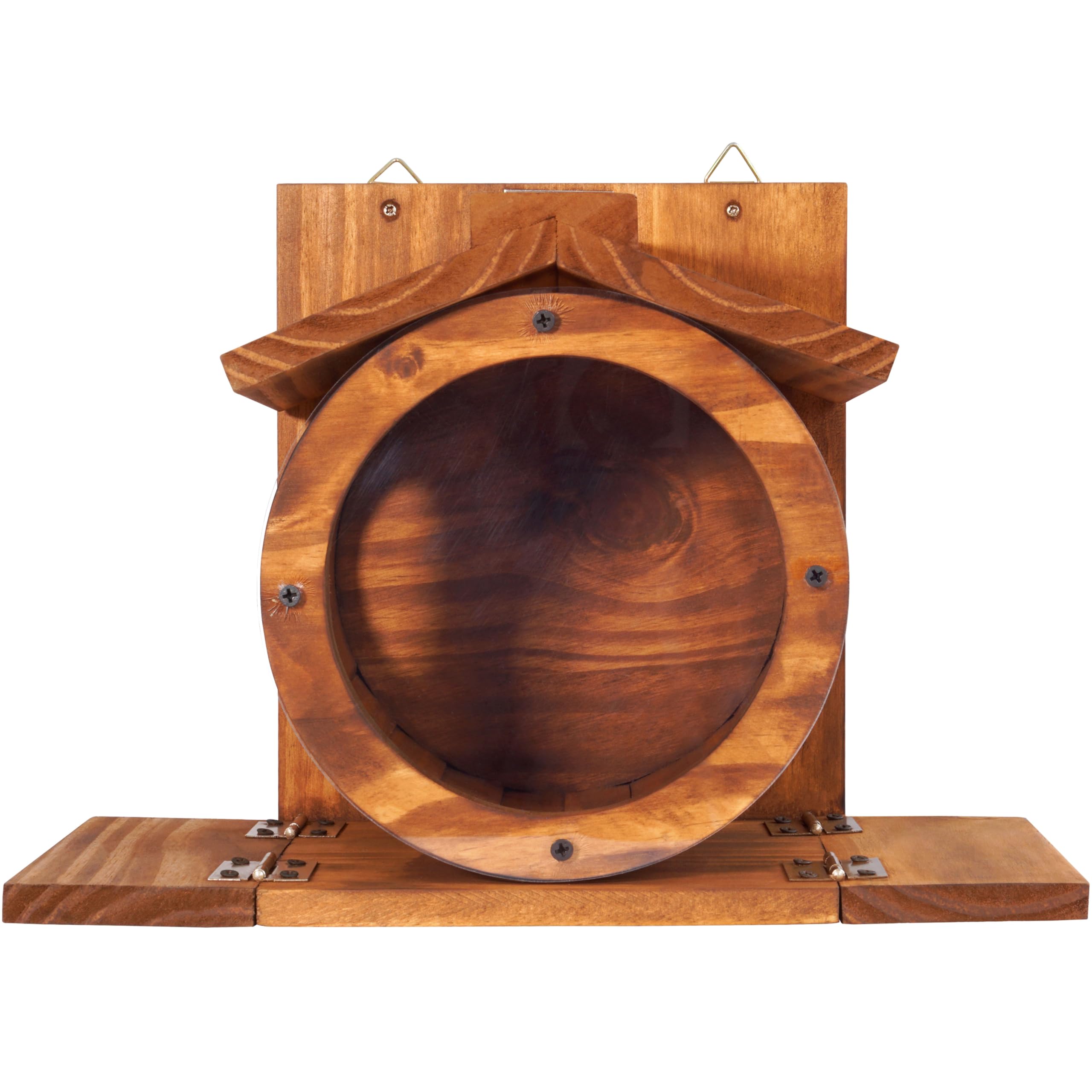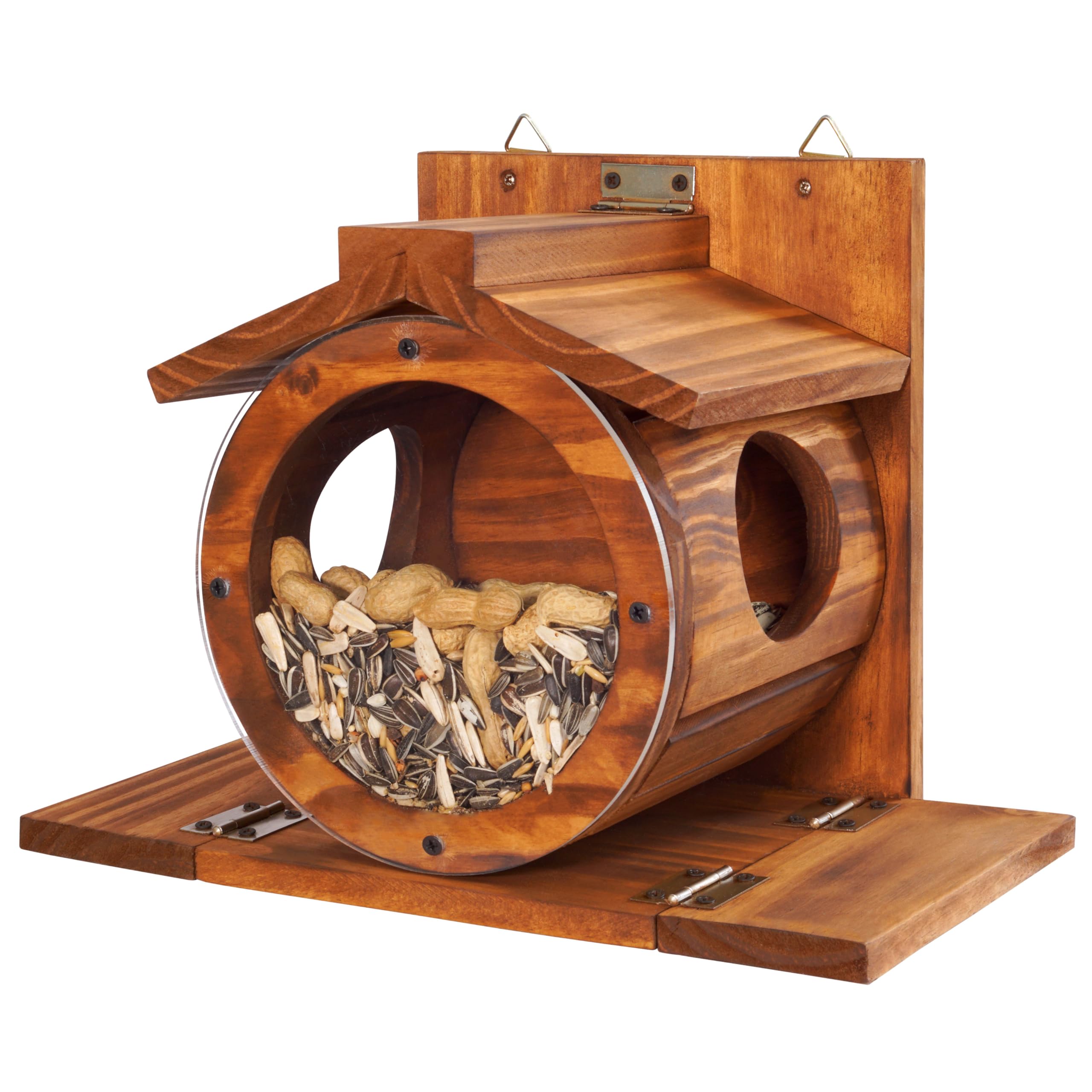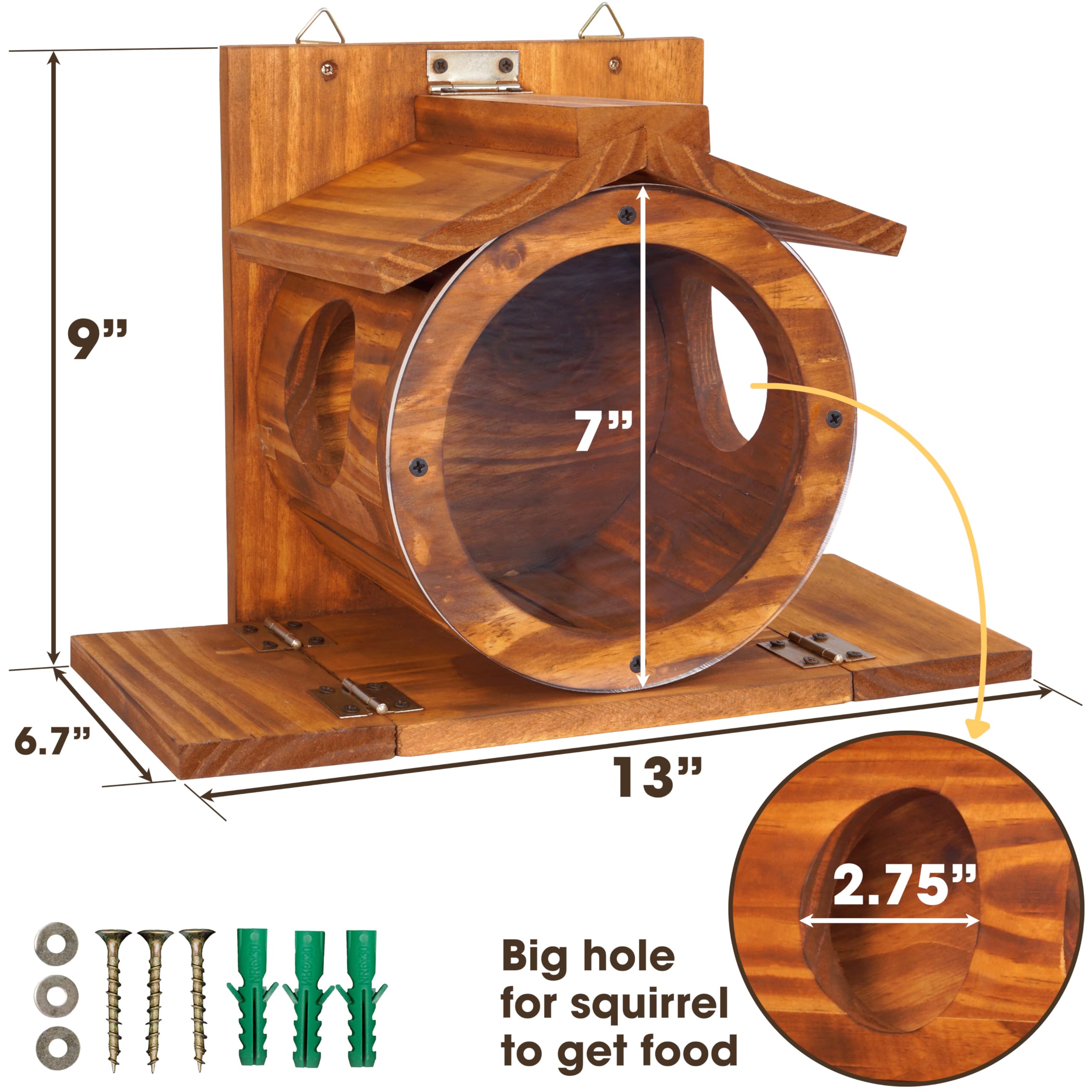 ✅ The Seed Tray is Cutely Designed in a Round Shape: Squirrels will be attracted by the cute shape of the feeder. The round seed tray has a large capacity and can hold many seeds. The front is a transparent acrylic panel that helps squirrels easily see the seeds. On both sides are two holes for squirrels to get in and harvest the seeds. Two standing platforms on both sides help the squirrel have a comfortable position when on duty.