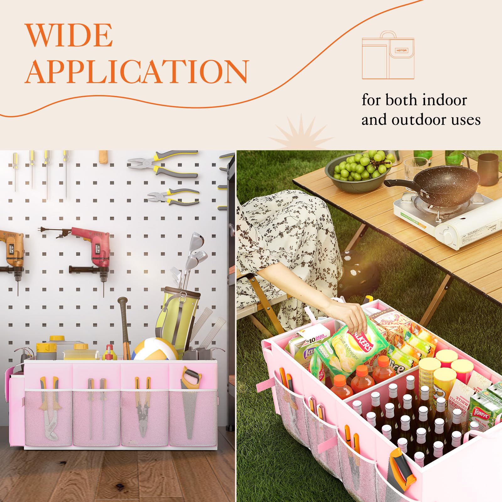 CONVENIENT ACCESS: HOTOR car trunk organizer for SUV is equipped with 2 compartments and 6 stretchy mesh pockets to make items easy to see and grab when needed. No more digging around a messy trunk to find what you need. Just grab and go.