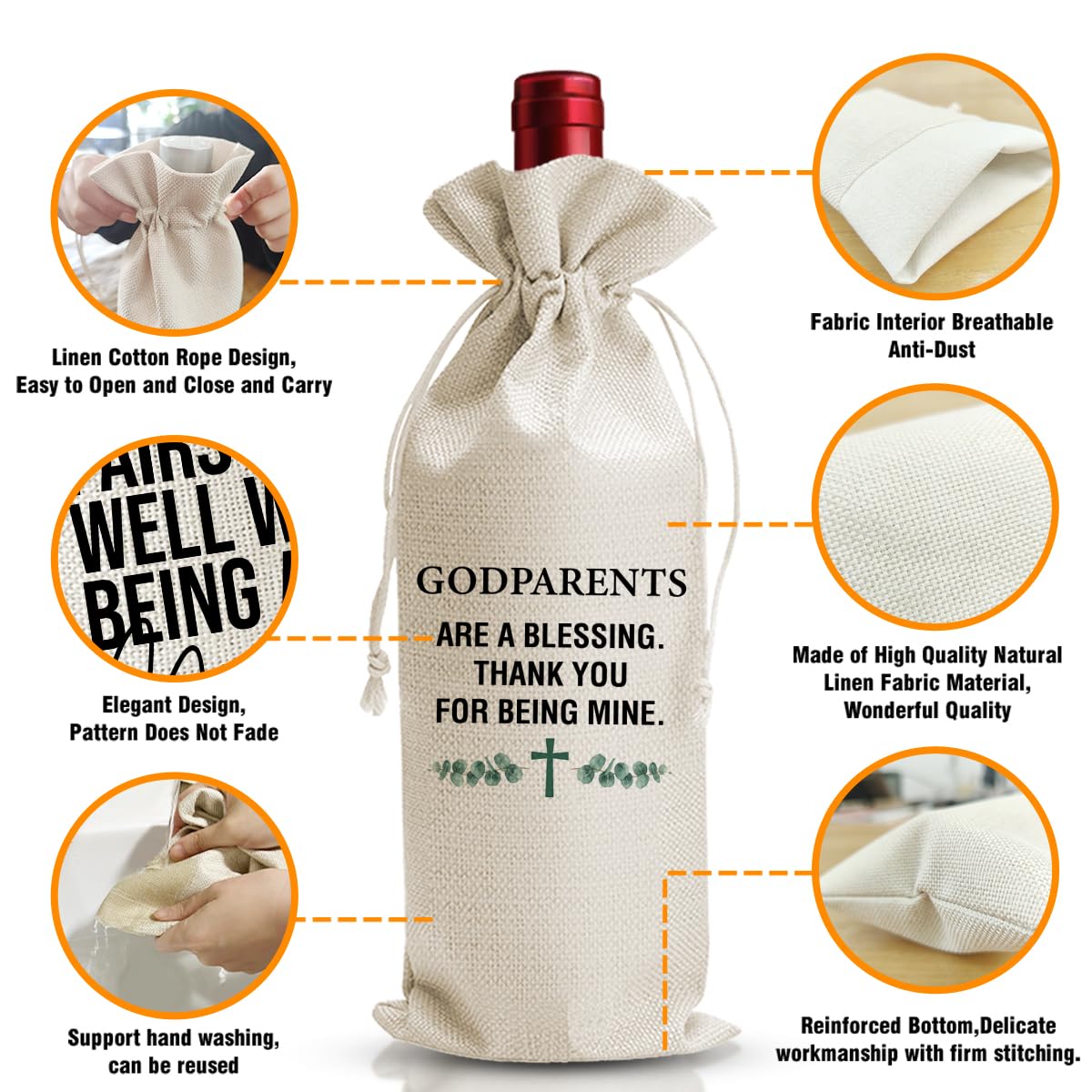 Material: Made of eco-friendly natural linen material."godparents Gift Wine Bags" wine drawstring bags, meet your different needs and you can share with your friends and families.