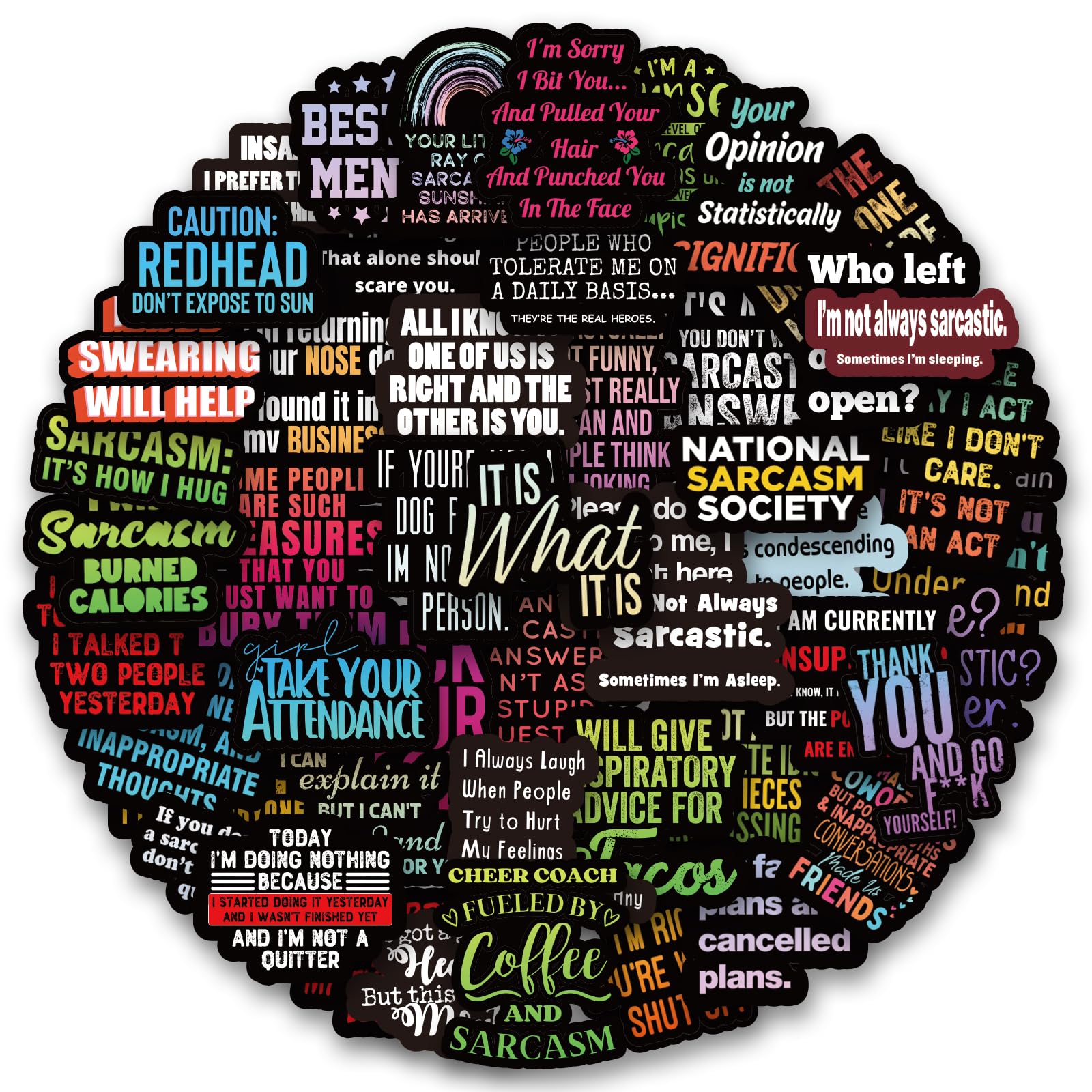【50Pcs Included】—These sarcasm Words theme stickers pack contains 50pcs no duplicated stickers, can be attached to computer, Laptop, skateboard, Luggage, refrigerator, guitar, motorcycle, bike, Mobile Phone, etc. Various patterns sticker pack can be great gift for children, kids, youth, friends, family and other DIY decoration.