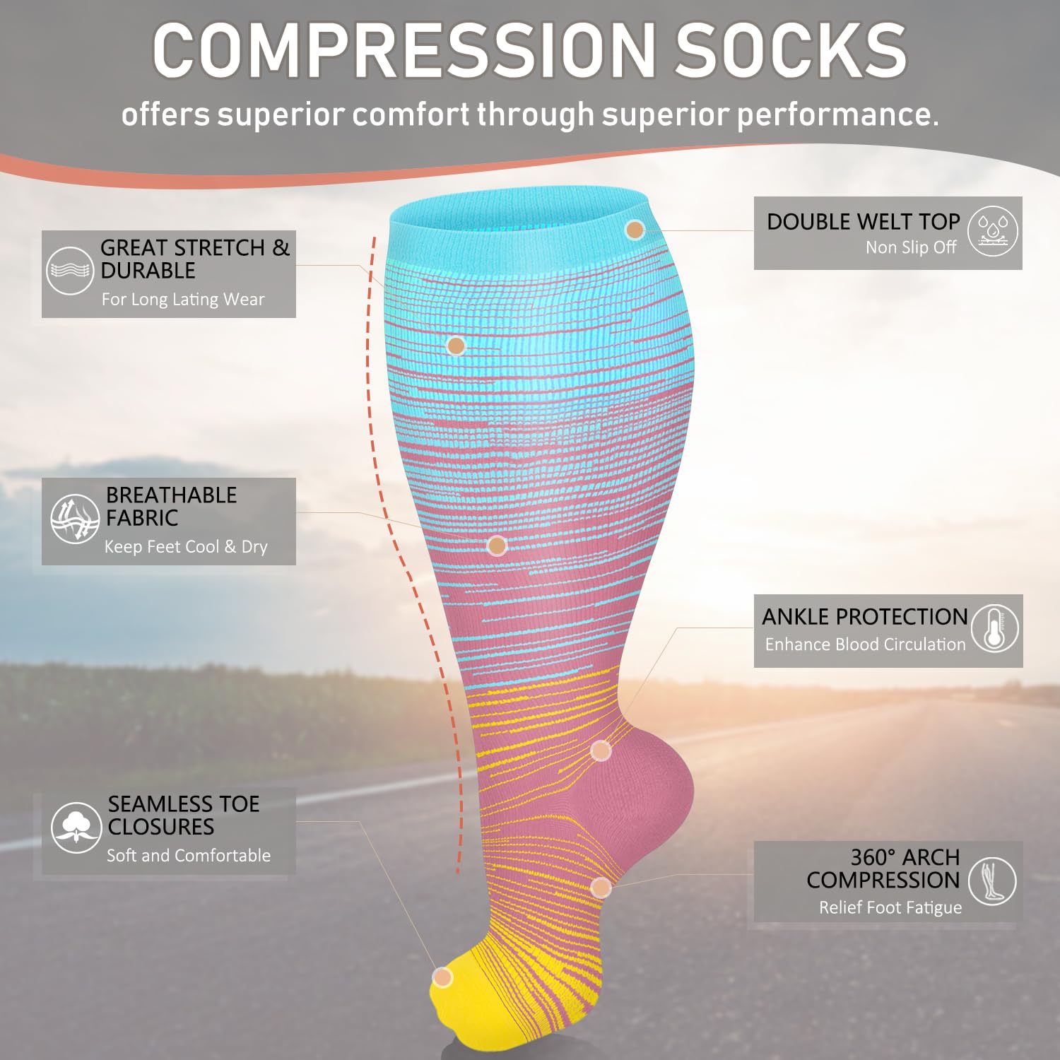 【More Size Choice】- Plus size (2XL-5XL) for ankle up to 16 inches, calf up to 28 inches’ circumference, you can refer to the size chart to choose the suitable size (and in general we suggest you choose the larger size if you are hesitating between two sizes). Our knee-high compression socks have nice and snuggly support without being too tight and enhance blood circulation effectively.