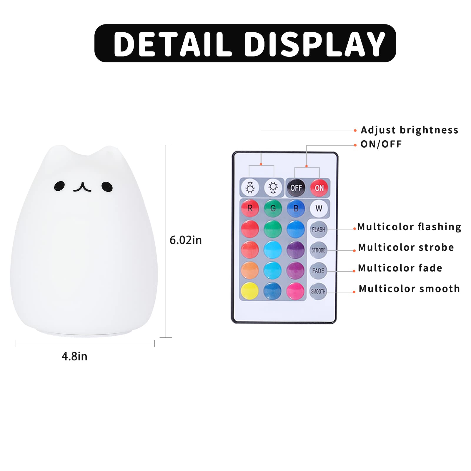 【TAP TO CONTROL CAT LAMP】 NOT REMOTE CONTROL. Tap to swicth warm light, 7 colorful lights, and 3 brightness adjustable. Kids easy to light up cat lamp.
