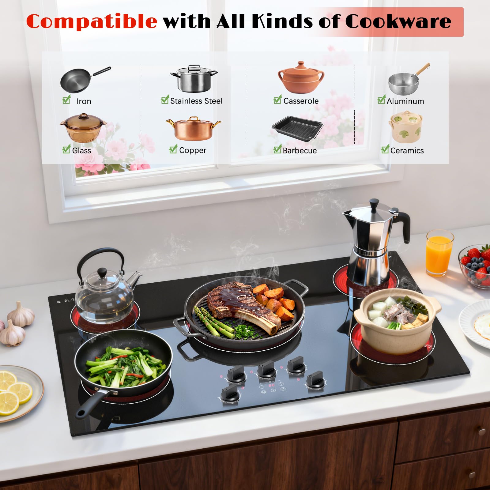 Product Description Power & Flexibility in Every Burner 2 Small Burners (1200W, 6.5”): Perfect for sauces, warming, or small pots. 1 Medium Burners (1800W, 7.87”): Ideal for everyday cooking — think pasta, stir-fries, or boiling veggies. Dual-Zone Burner (1000W inner/2000W outer, 4.72" inner/9.06”outer), Triple-ring Burners(1050W/2150W/3000W,5.43"/9.06"/11.42") : Expand the outer zone for large stockpots, griddles, or casserole dishes. This electric stove top adapts to any cookware size. Controls That Work for Everyone 1.Knobs for Each Burner: Adjust 9 power levels with a simple turn — no confusing menus. Perfect for seniors or anyone who prefers tactile controls. 2.Touch Controls: Set a 99-minute timer, use the pause function (temporarily stop cooking without losing settings), or check the residual heat indicator. This built-in electric cooktop offers the best of both worlds. Safety First, Always 1.Child Safety Lock: Press “+” and “-” at the same time to lock controls (indicated by “Lo”) — keep little hands from changing settings. 2.No Electromagnetic Radiation: Cook worry-free, even if you’re pregnant or sensitive to EMF. 3.Overheat Protection: The cooktop shuts off automatically if temperatures rise too high, preventing accidents. Easy to Clean, Easy to Install The black glass surface of this 36 inch electric cooktop is a breeze to maintain — just wipe with a damp cloth. A bonus scraper handles stuck-on food, so cleanup is never a chore. For installation: Dimensions: Stovetop 35.43”W x 20.47”D x 3.07”H; Cut-out 34.25”W x 19.3”D. Electrical: 240V hardwiring (40A, no 110V plug). We recommend professional installation for this high-power electric cooktop.