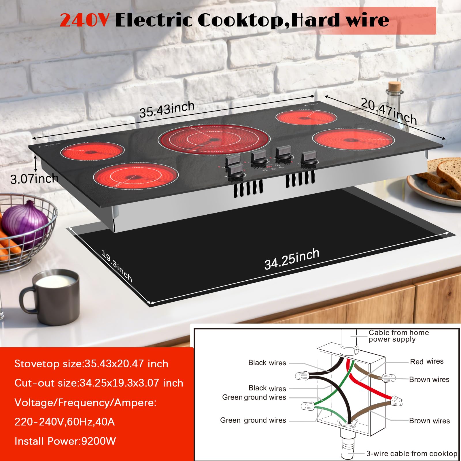 【240V Hardwired Installation for High Power】 The 240V electric cooktop is designed for embedded setup: Stovetop size 35.43"x20.47"x3.07", cut-out size 34.25"x19.3". This 9200W electric cooktop 36 inch requires 240V hardwiring (40A, no 110V plug) — professional installation recommended for optimal performance.
