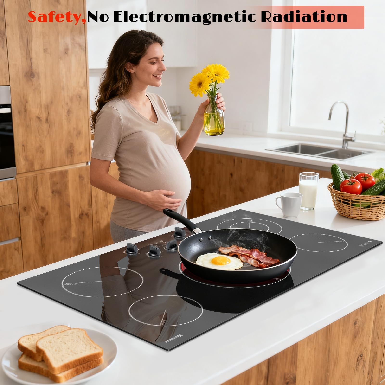 【Electric Cooktop 5 Burners with Advanced Safety Features】 Stay safe with a child safety lock (activate via “+/-” press, indicated by “Lo”), no electromagnetic radiation (safe for pregnant users), and overheat protection. This 36 inch electric ceramic stove top prioritizes your family’s well-being.
