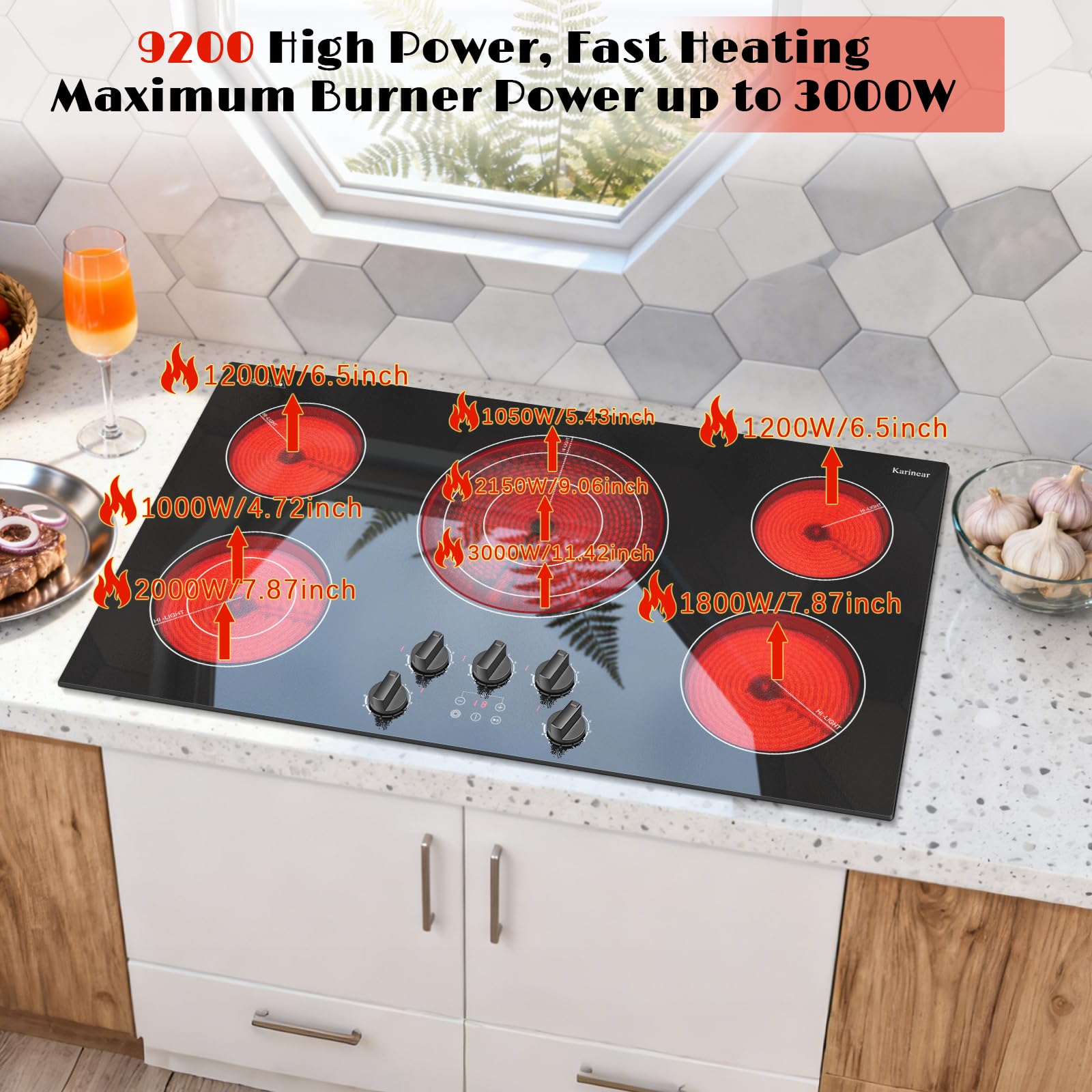 【9200W Electric Ceramic Cooktop for Versatile Cooking】 This 36 inch electric stove is a high-power appliance with a total output of 9200W. Each burner features 9 power settings. The lower left and center burners are dual-ring and triple-ring burners, respectively, allowing adjustment of heating coverage and power to accommodate various cookware and cooking requirements.