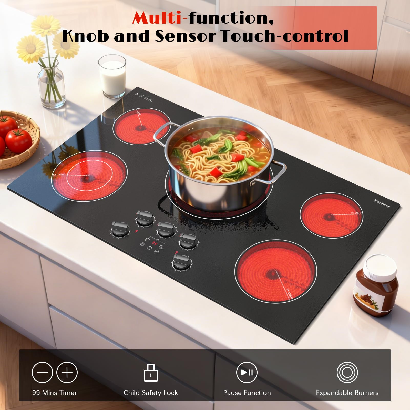 【Intuitive Knob + Touch Controls for Precision Cooking】 Each burner on this 36" electric cooktop features an individual knob for 9 power levels (perfect for seniors or visual impairments), plus touch controls for a 99-minute timer, auto-shutoff, pause function, and residual heat indicator. This built-in cooktop combines classic usability with modern convenience.