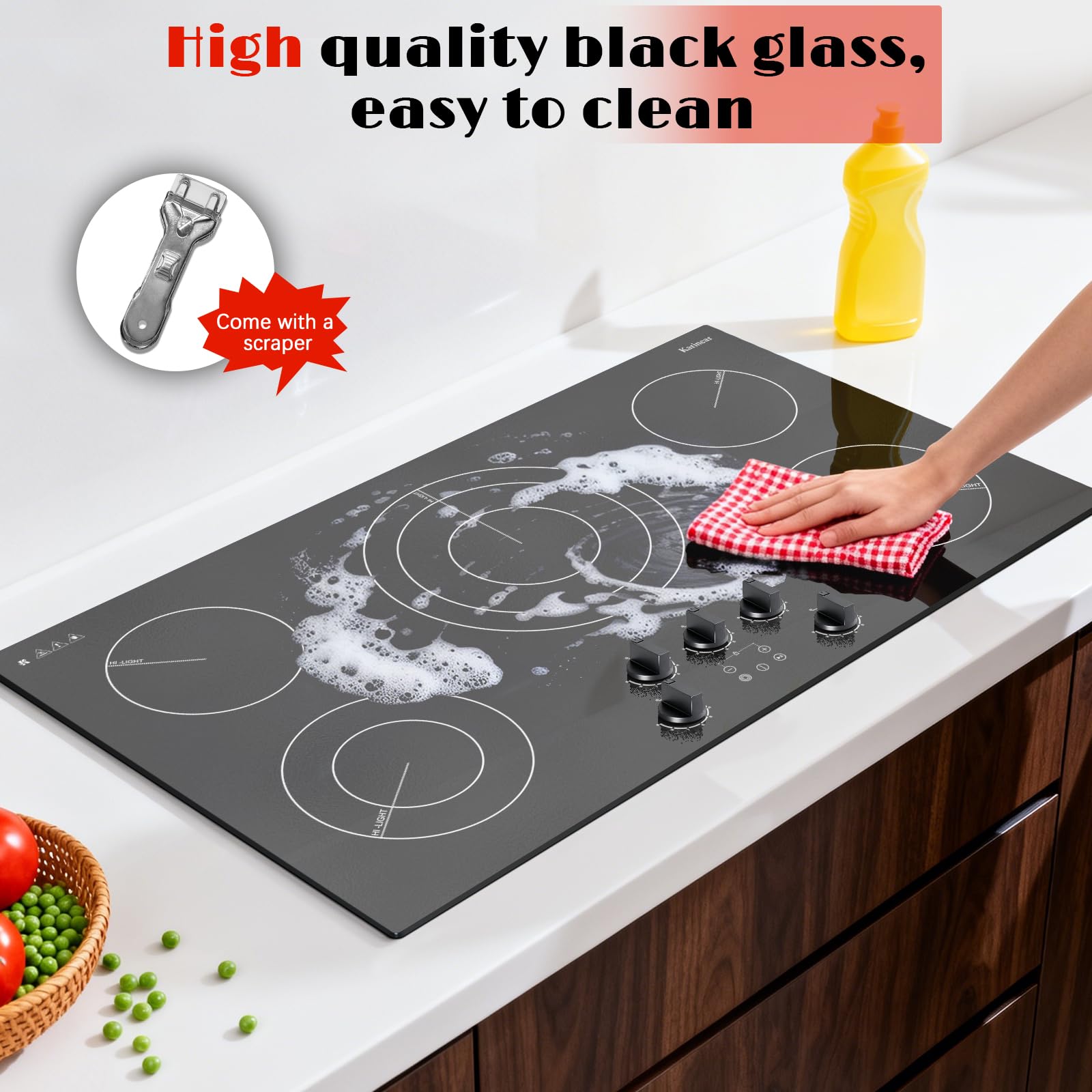 【Easy-Clean Black Glass Surface + Bonus Scraper】 The smooth black glass electric cooktop wipes clean with a damp cloth. A free scraper tackles tough stains — keeping your 36 inch built-in electric cooktop looking new. Spend less time cleaning, more time enjoying your meals.
