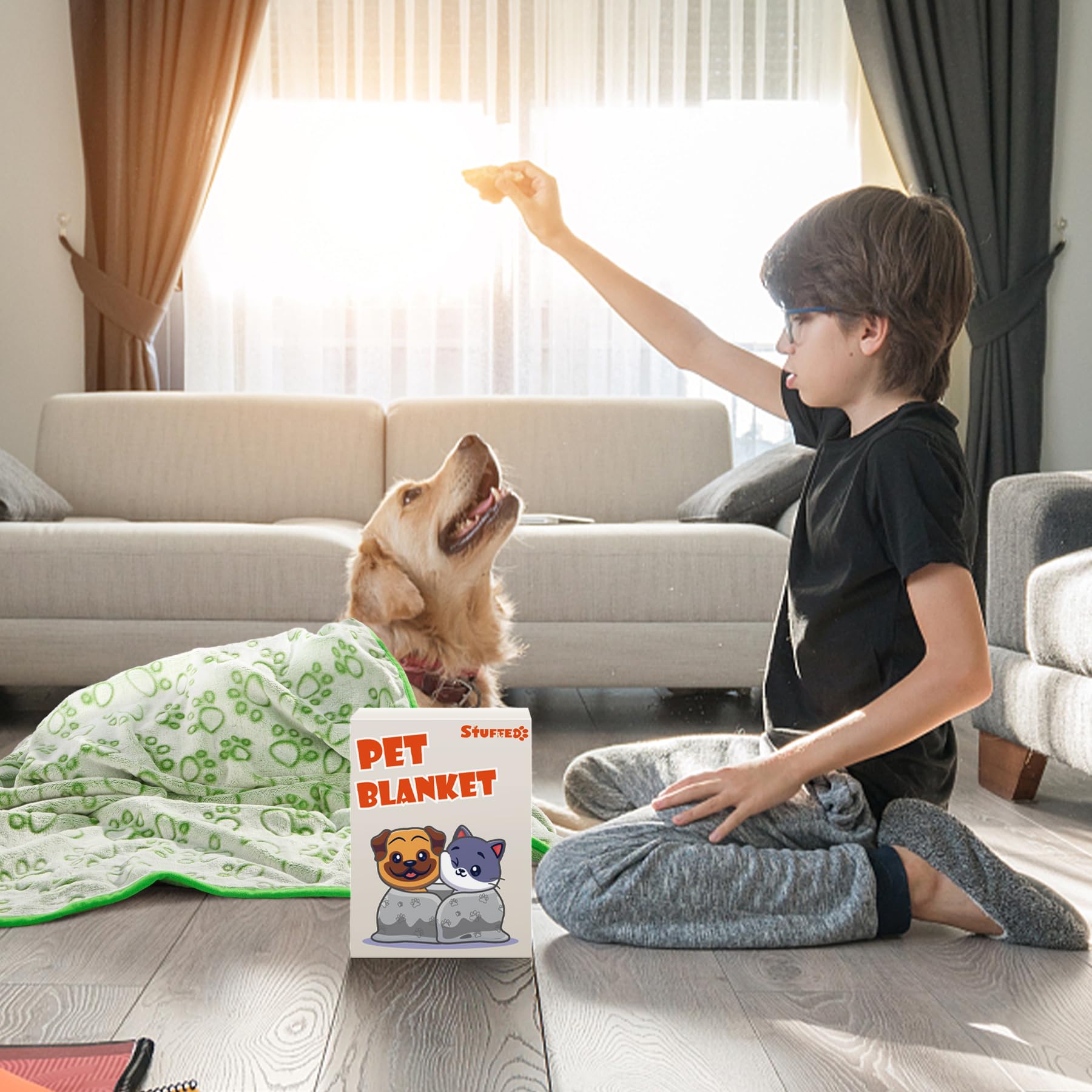 PREMIUM MATERIAL FOR PETS ONLY: Super Soft & Warm comfy fleece for your pets, exclusive cute paw prints design on the top, lovely solid green color on the back, no fear of peeing, bitting, chewing and tearing. Your dog will love this dog products! A good match for puppy toys.