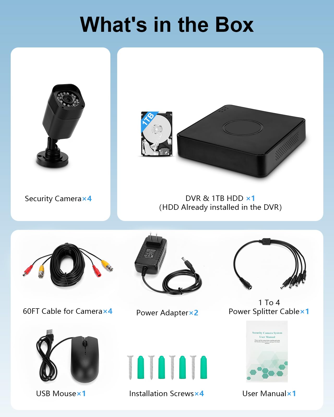 5MP HD CCTV Camera Security System: Enjoy clear imaging while eliminating monitoring blind spots. Including 4 cameras, the 8-channel system provides ample space for additional cameras. 4 packages of 60FT BNC cables provide video and power for your cameras.