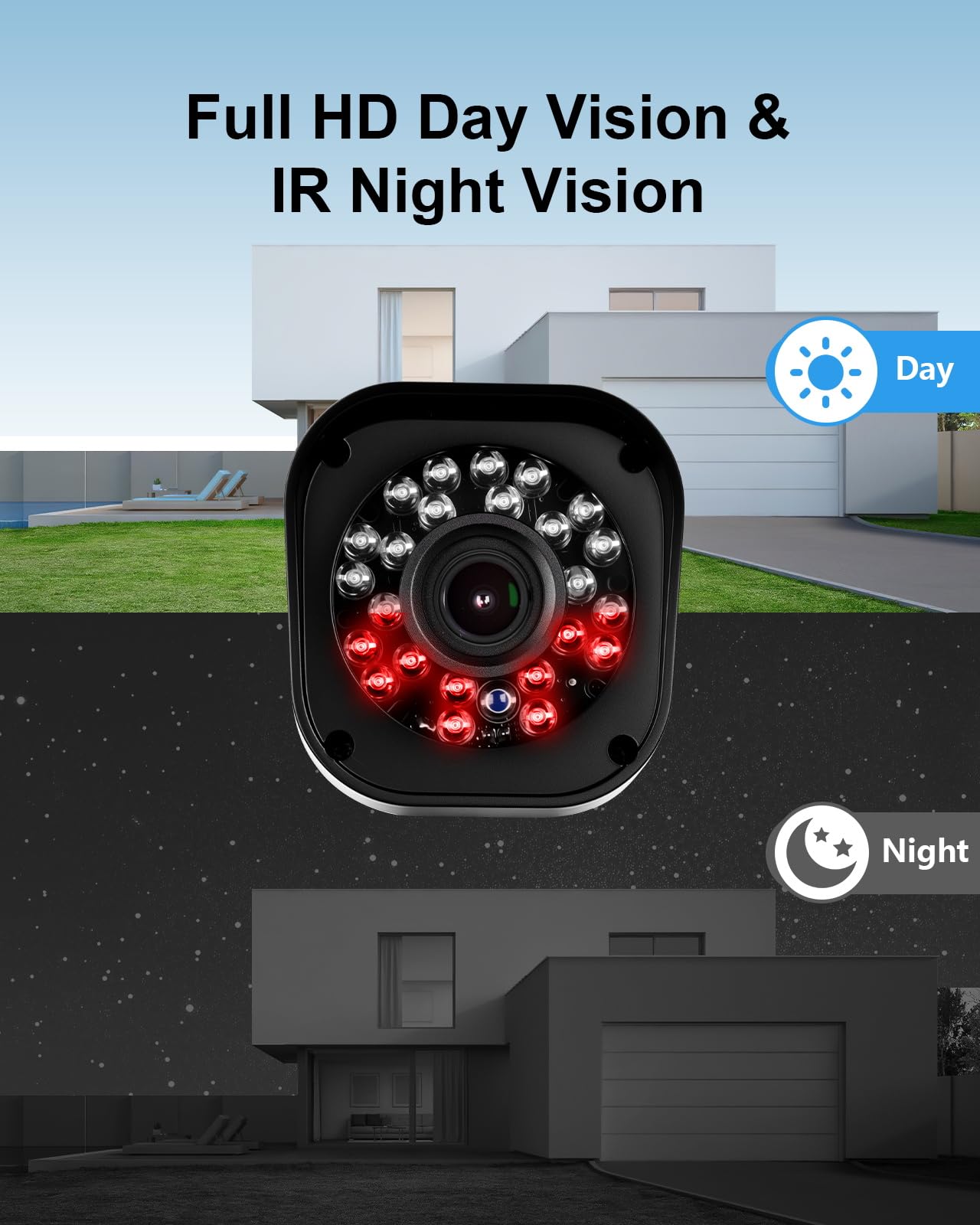 100FT Night Vision & IP68 Waterproof: You can capture clear images day and night. With a built-in IR cut filter and automatic infrared LED activation at night, it delivers authentic imagery. The wired cameras for home security are rust-proof, weather-resistant, and perform stably in extreme conditions.