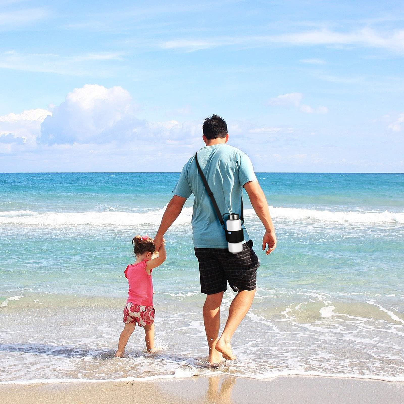 Easy to Use: Made of hook and loop fastener to wrap the water bottle, very convenient to use. The shoulder hook on one side can be adjust the position, keep the water bottle stay vertical during carrying.