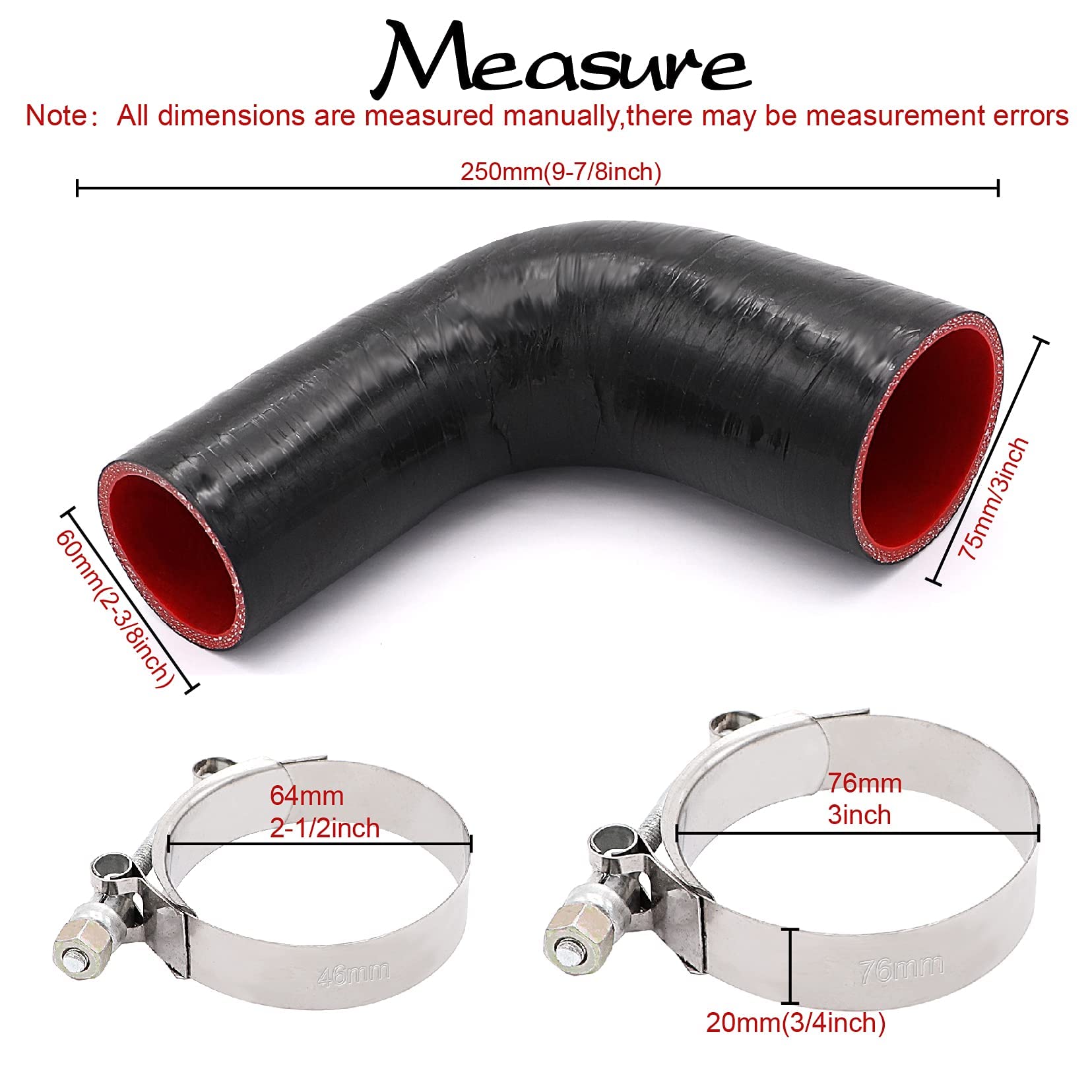 Size: ID2"to2.5"(51mm to 63mm) T-Bolts:One of Diameter 2.5"(64mm),Another One of Diameter 3"(76mm) Silicone Hose Wall Thickness: 5mm 4-Ply Length: 102mm one leg Range of Working TEMP: -60 C to +230C Advantages: It has an extremely low degree of water absorption and its mechanical properties show minimal change, even after long period of immersion. Package include: 1x hose, 2x T-Bolts