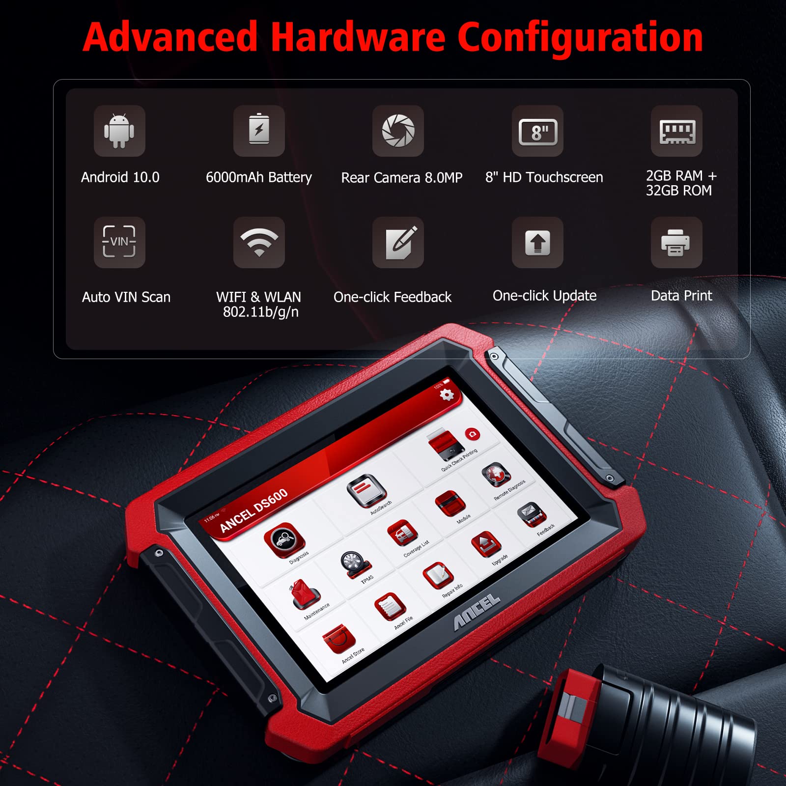 【Advanced Hardware Configuration】+ 【More Cost-effective Than Competitors】ANCEL DS600 Plus equipped with the most advanced Android 10.0 OS, 6000mAh rechargeable battery, 8 Megapixels Rear-Facing Camera, 8-inch touchscreen, 2GB RAM + 32GB storage, 2.0 GHz quad-core CPU processor, faster auto VIN technology, 2.4GHz&5GHz Dual-Frequency Wi-Fi, which makes DS600 more cost-effective than other pro diagnostic scanners.