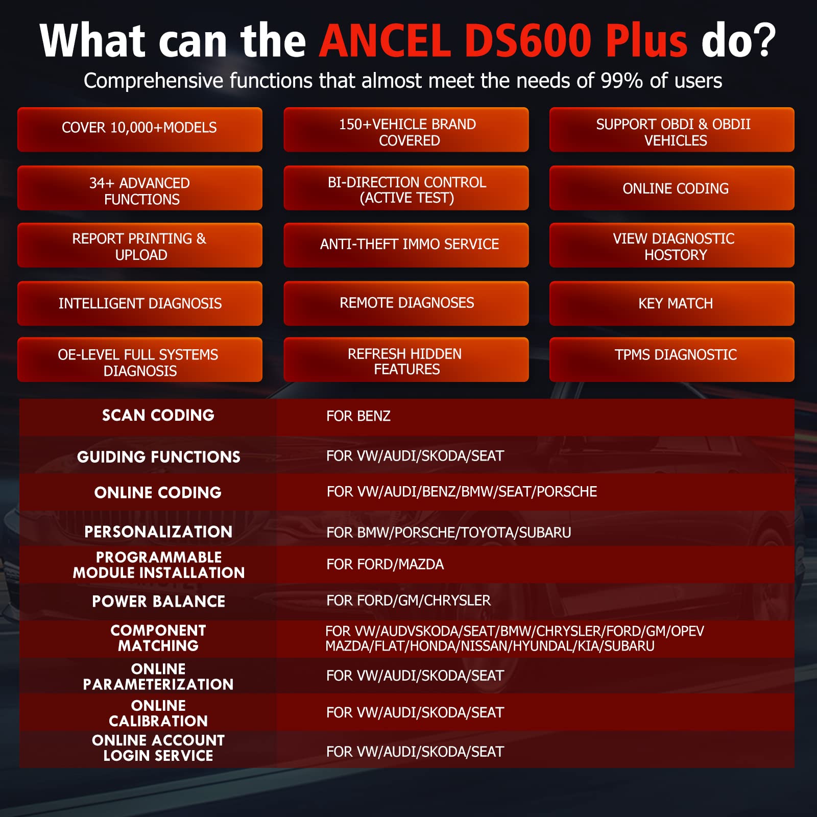 【Latest Added OE-Level Exclusive Functions】ANCEL DS600 Plus professional scan tool updated more OE-Level features, such as Online Coding, Guiding Functions, Anti-theft Service, AutoAuth for FCA SGW, Flash Hidden Functions, Power Balance, Component Matching, Online Personalization, Online Calibration and more, which are useful for technicians, advance DIYers, garages, car dealers.