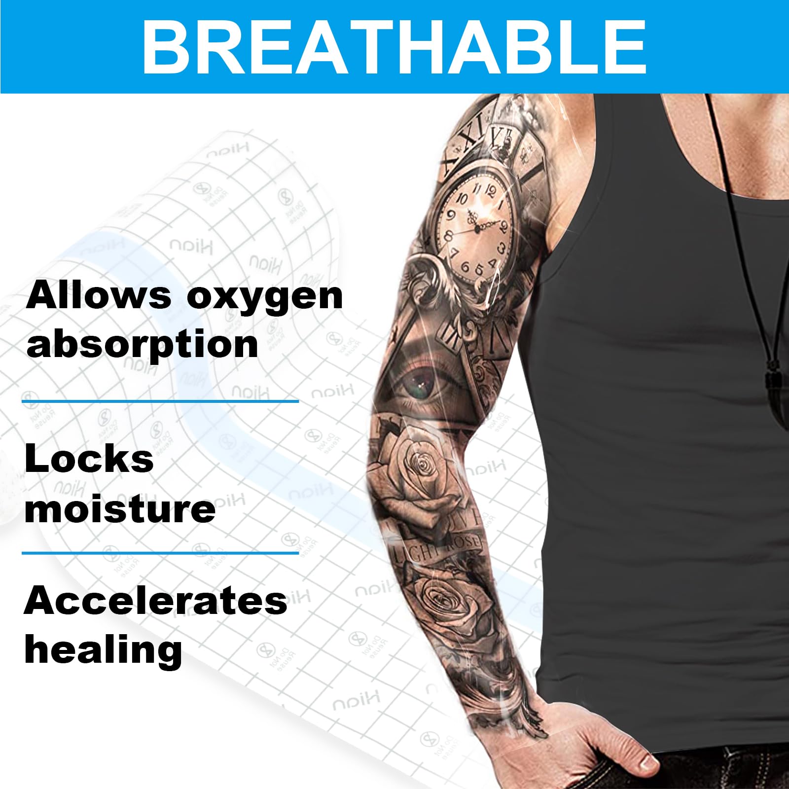 MEDICAL GRADE ADHESIVE: The tattoo aftercare bandage uses medical grade adhesive which is hypoallergenic to skin. It has good adhesion to stick well on your skin, and can be removed easily without leaving any glue residue on it.