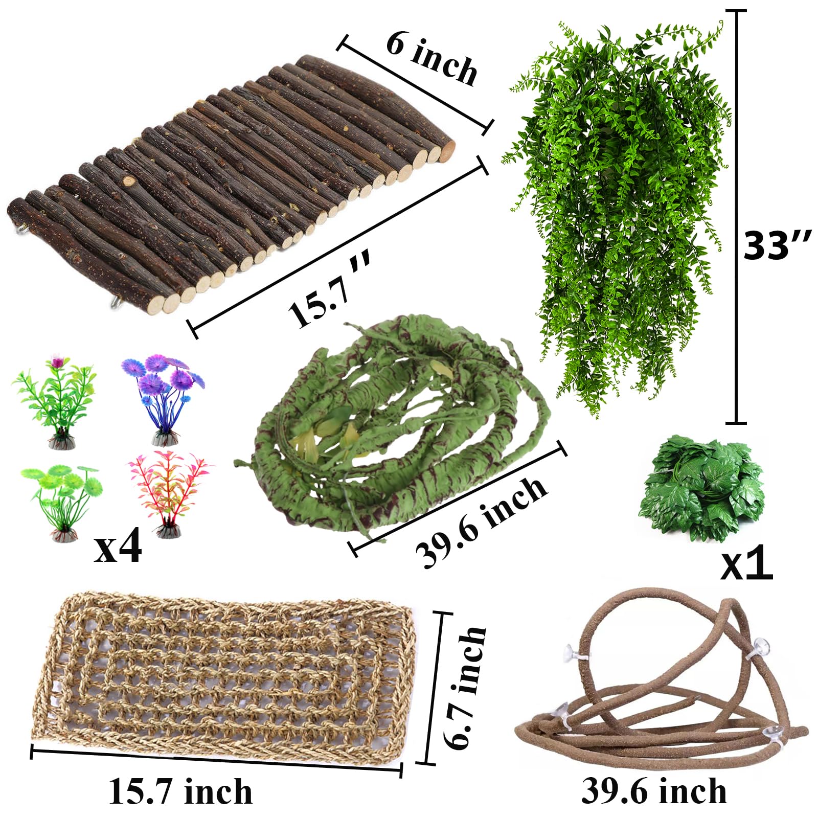 【Package Include】 1x Bearded dragon hammock; 1x Bridge; 1x hanging plant; 2 reptile vines; 2 x leaves; 4 x stand plants, suction cups. Perfect for reptile habitat decorations, terrarium