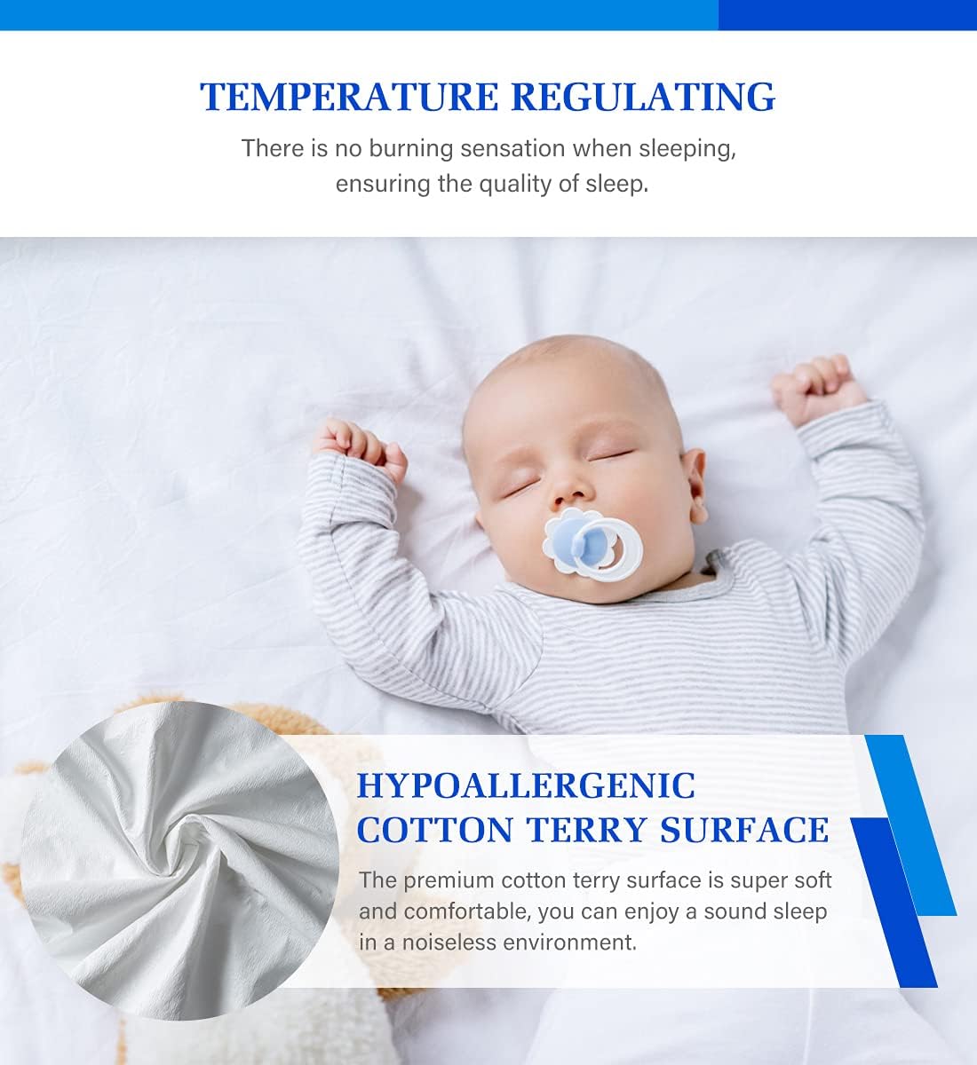 【Noiseless & Comfortable 】The terry surface allows air and heat to pass through, ensuring softness and great breathability. The specially designed waterproof TPU membrane is made of quality elastic material that is ultra-soft and flexible, and will not cause the rubbery, swishing sounds that other mattress protectors may do.