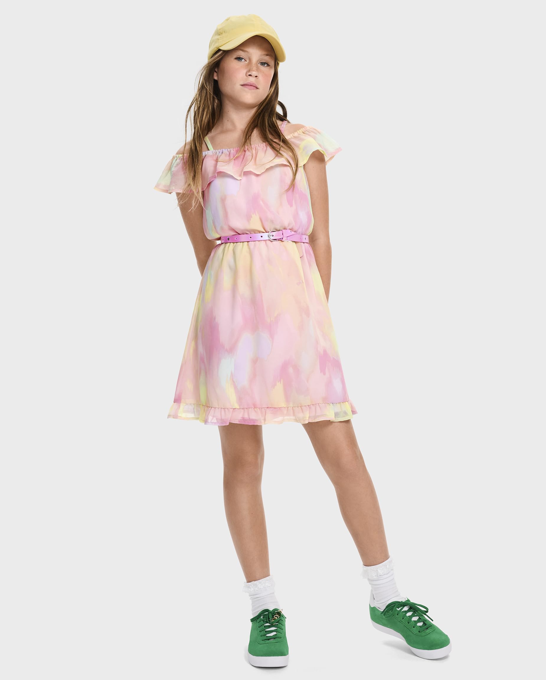 FIT & DESIGN: Elasticized off-shoulder ruffle neck, adjustable straps, ruffle hem, above-knee length