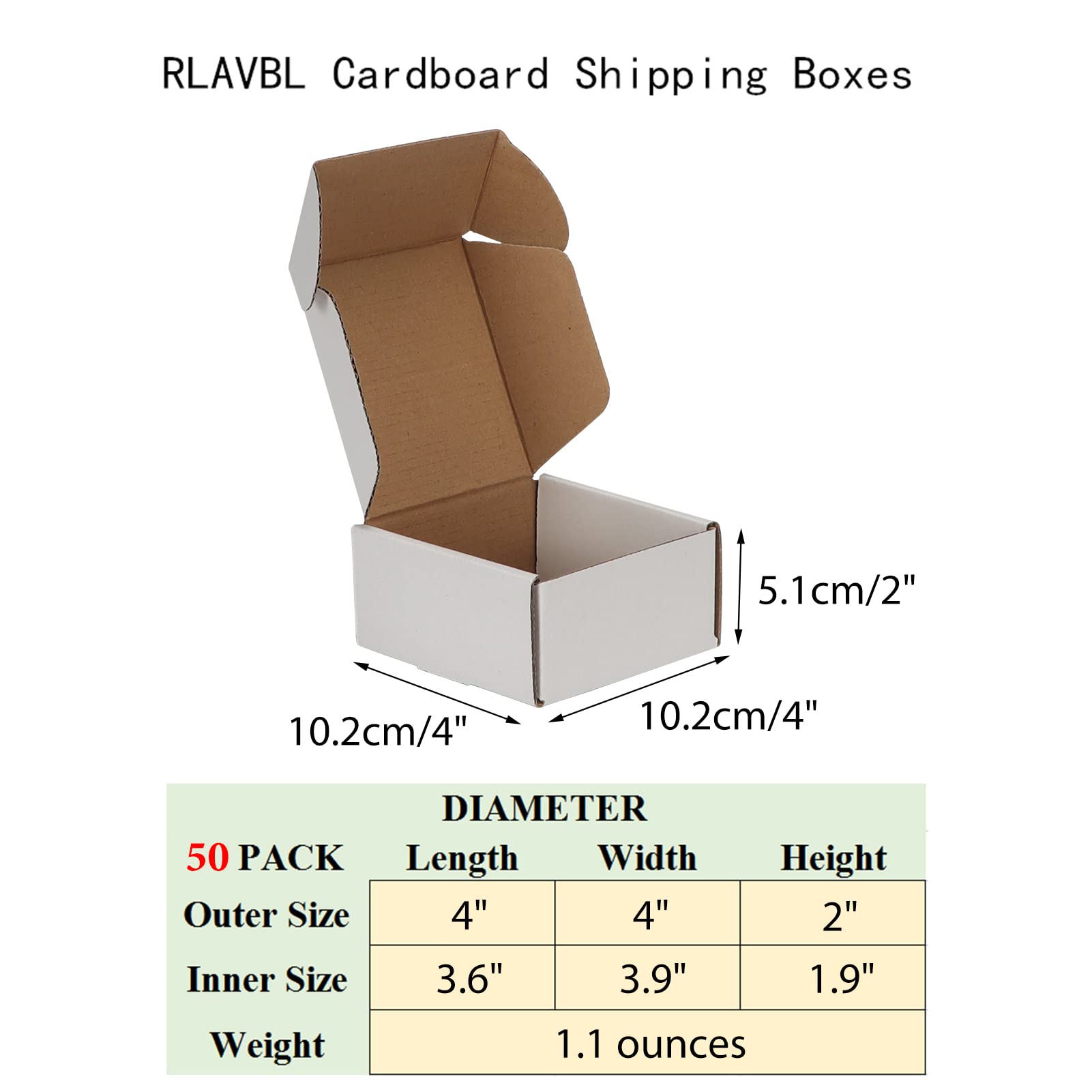 DIMENSION: The shipping boxes set includes 50 packs of the cardboard box. The size of this small moving box is 4” x 4” x 2”(L x W x H), suitable for packing or mailing those small and lightweight items.