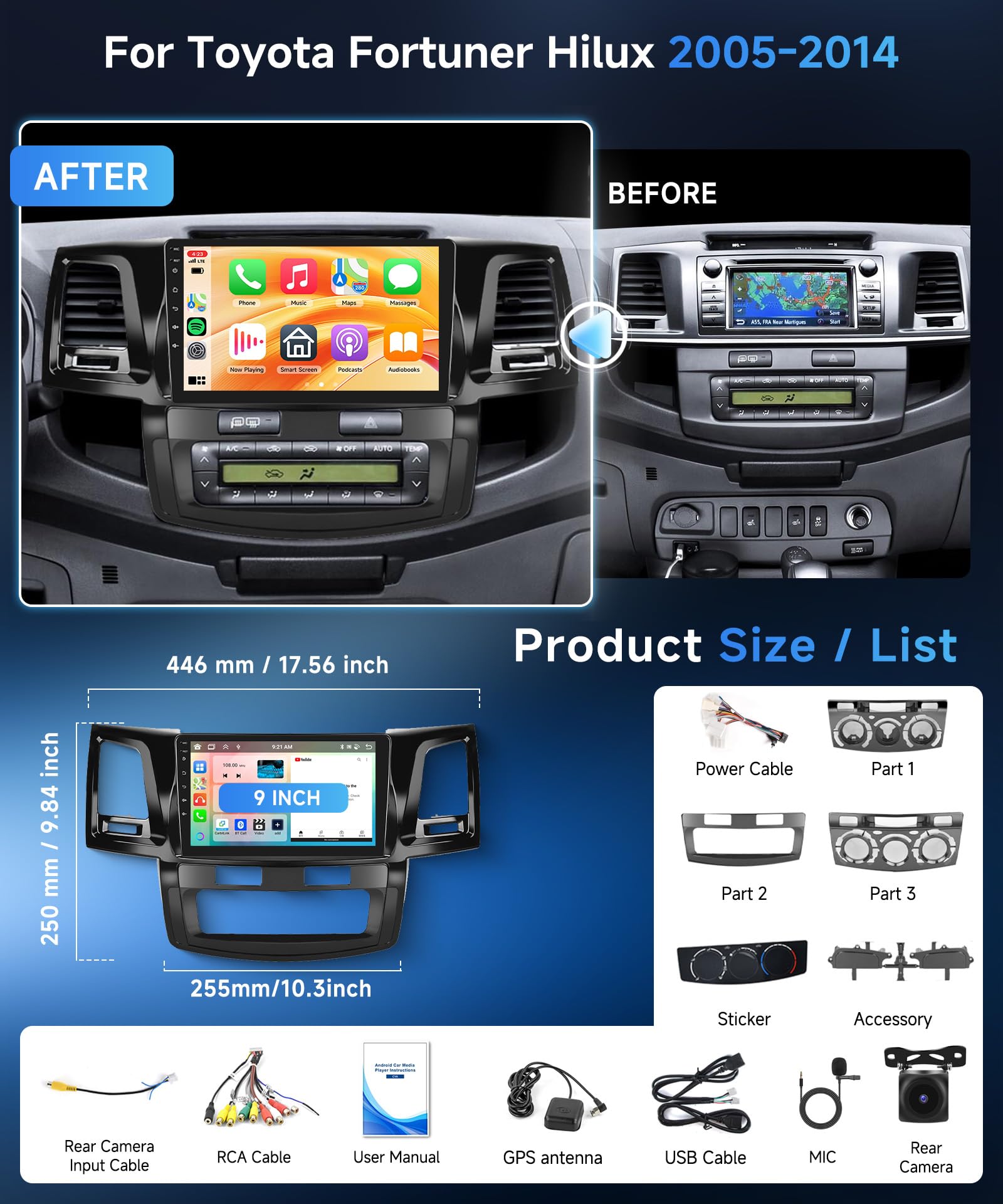 Android Car Stereo for Toyota Fortuner Hilux 2005-2014: Upgrade your driving experience with our Android Car Stereo designed specifically for Toyota Fortuner 2005 2006 2007 2008 2009 2010 2011 2012 2013 2014 and Toyota Toyota 2005 2006 2007 2008 2009 2010 2011 2012 2013 2014 models. 9-inch HD touch screen: Features a large 1280x720 resolution display with responsive touch control for easy and intuitive operation, ideal for car stereo and multimedia head units.