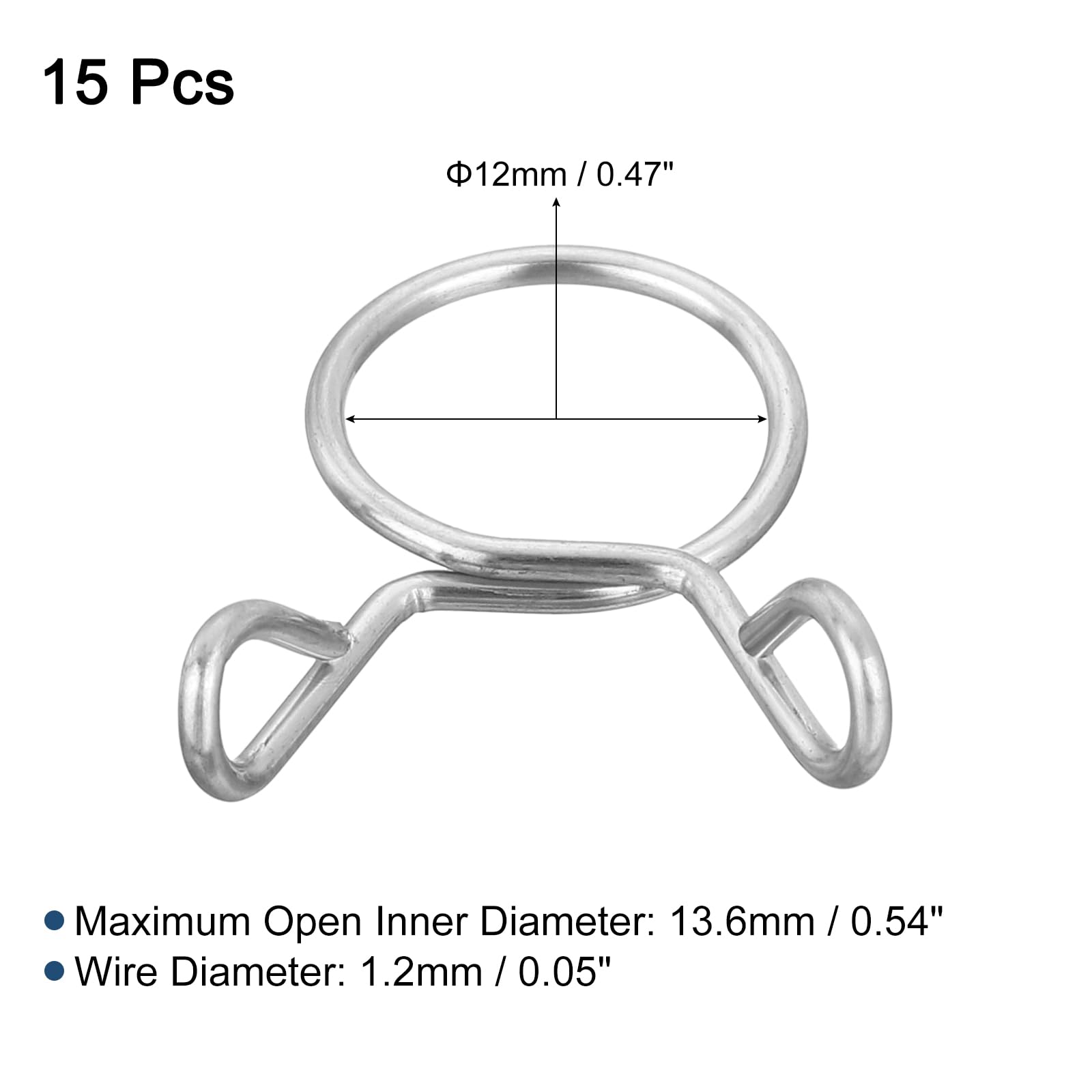 Package and Size: Material: 304 Stainless Steel, Maximum Open Inner Diameter: 13.6mm / 0.54inch, Inner Diameter: 12mm / 0.47inch, Wire Diameter: 1.2mm / 0.05inch, Package Content: 15 Pcs Fuel Line Hose Clips