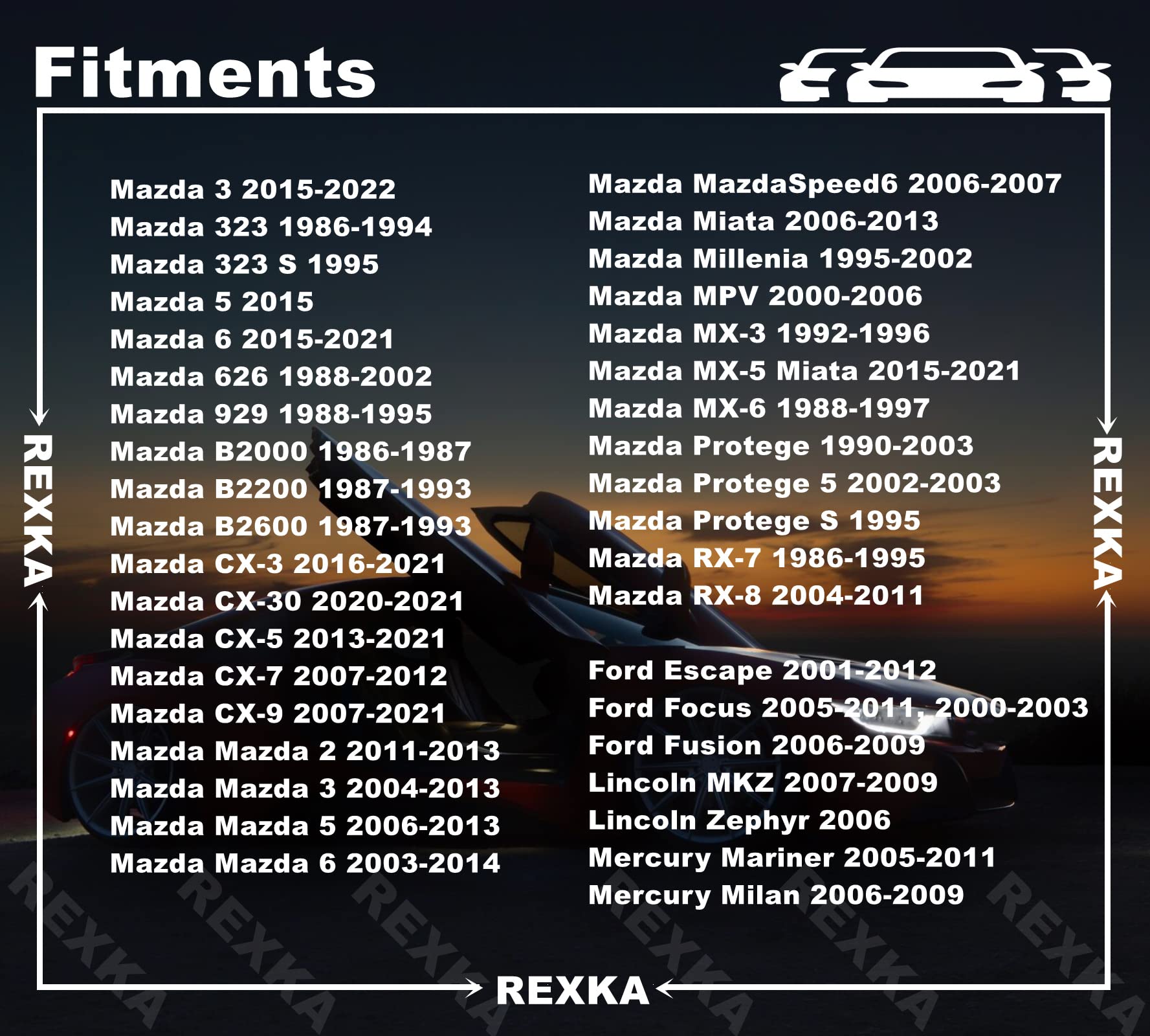 Replaces Mazda: B092-51-833, Fits Mazda 2, Mazda 3, Mazda 5, Mazda 6, Mazda 626, Mazda CX-3, Mazda CX-30, Mazda CX-5, Mazda CX-7, Mazda CX-9, Mazda Millenia, Mazda MPV, Mazda MX-5 Miata, Mazda Protege, Mazda Protege5, Mazda RX-8