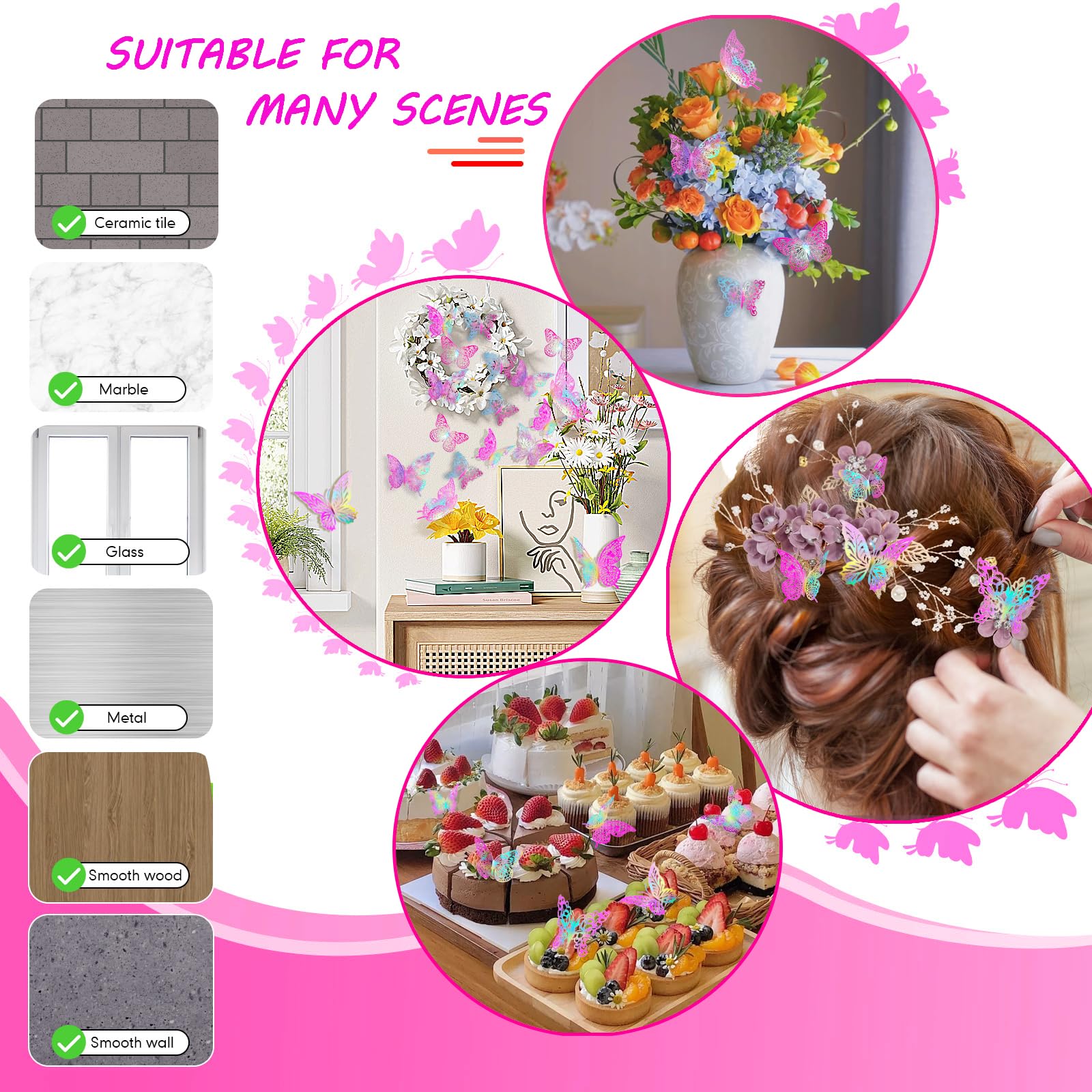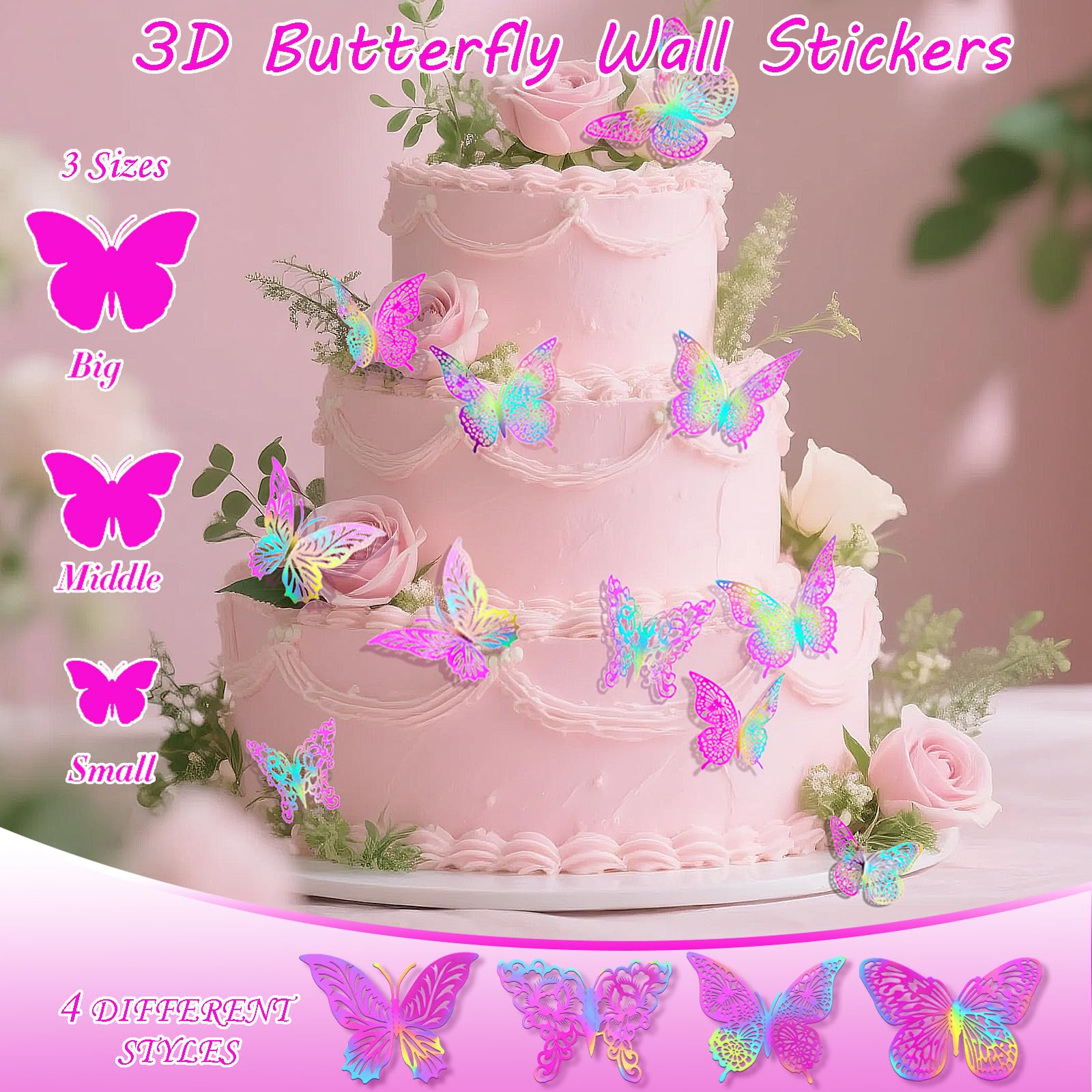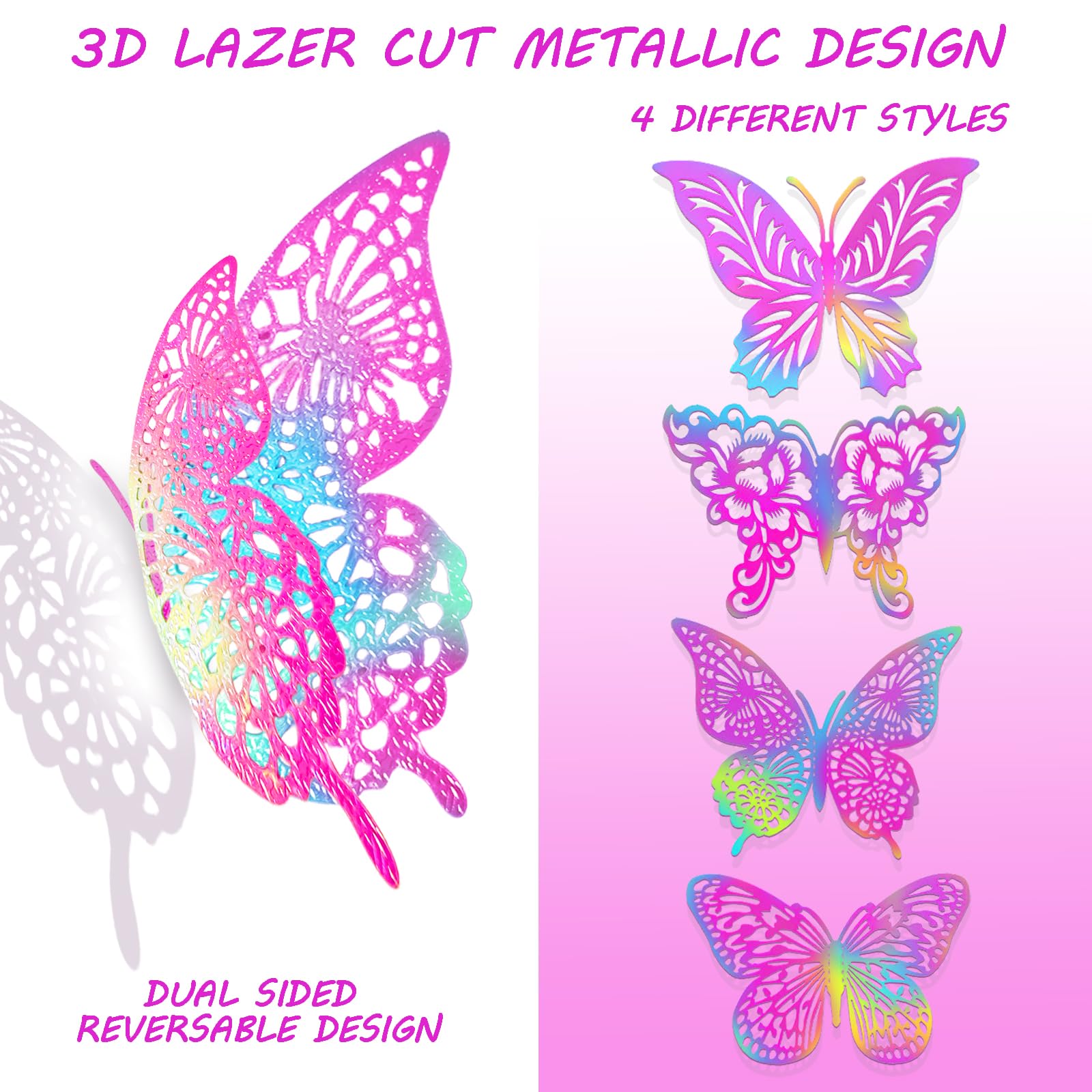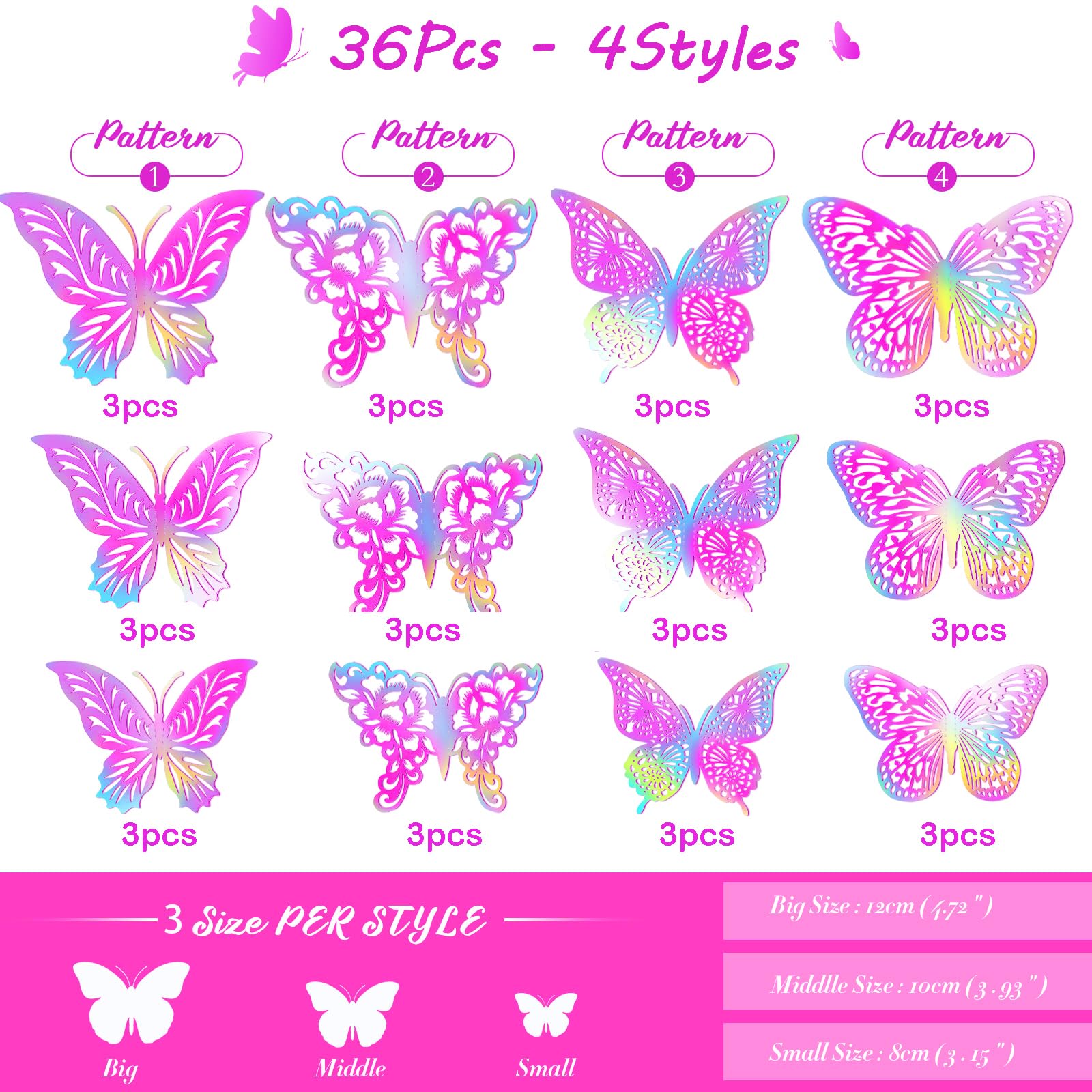 What You Get - 48pcs new design metallic butterfly decors in 4 styles. Each style has 3 sizes in 12cm (4.72) of large, 10cm (3.93”) of medium and 8cm (3.15”) of small, and every size have 4 pieces. The package also contains 48 pieces of removable double-sided adhesive.