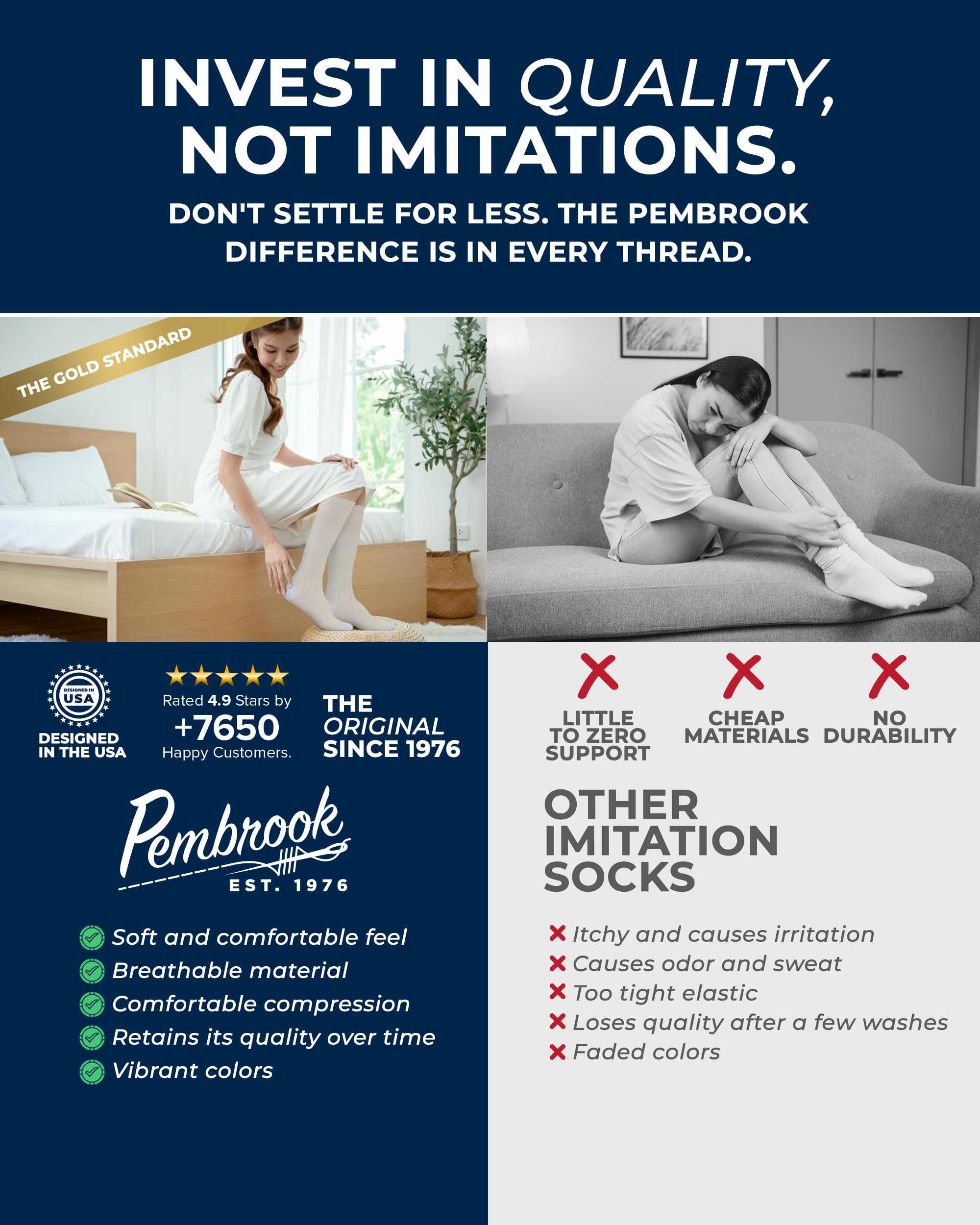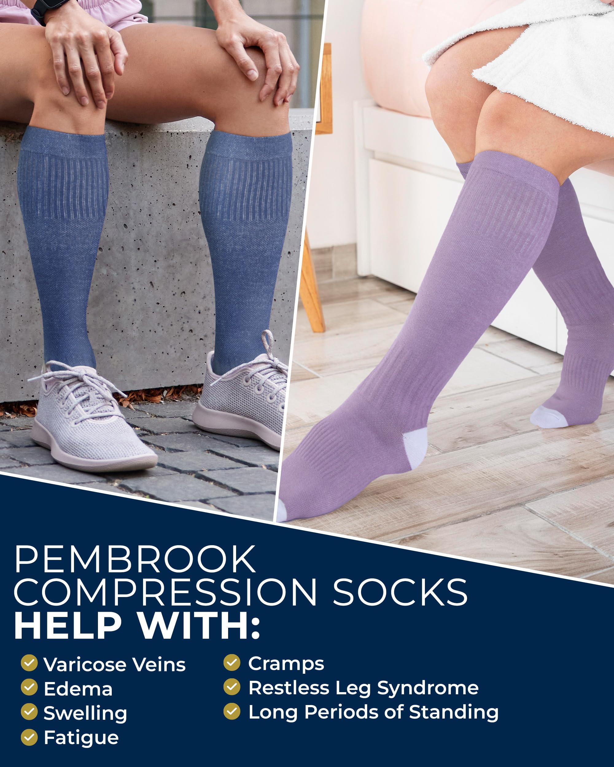 Boost Circulation & Ease Discomfort - These Pembrook light compression socks deliver gentle 8-15 mmHg compression to support healthy blood flow, minimize swelling, and keep your legs feeling refreshed and energized throughout the day.