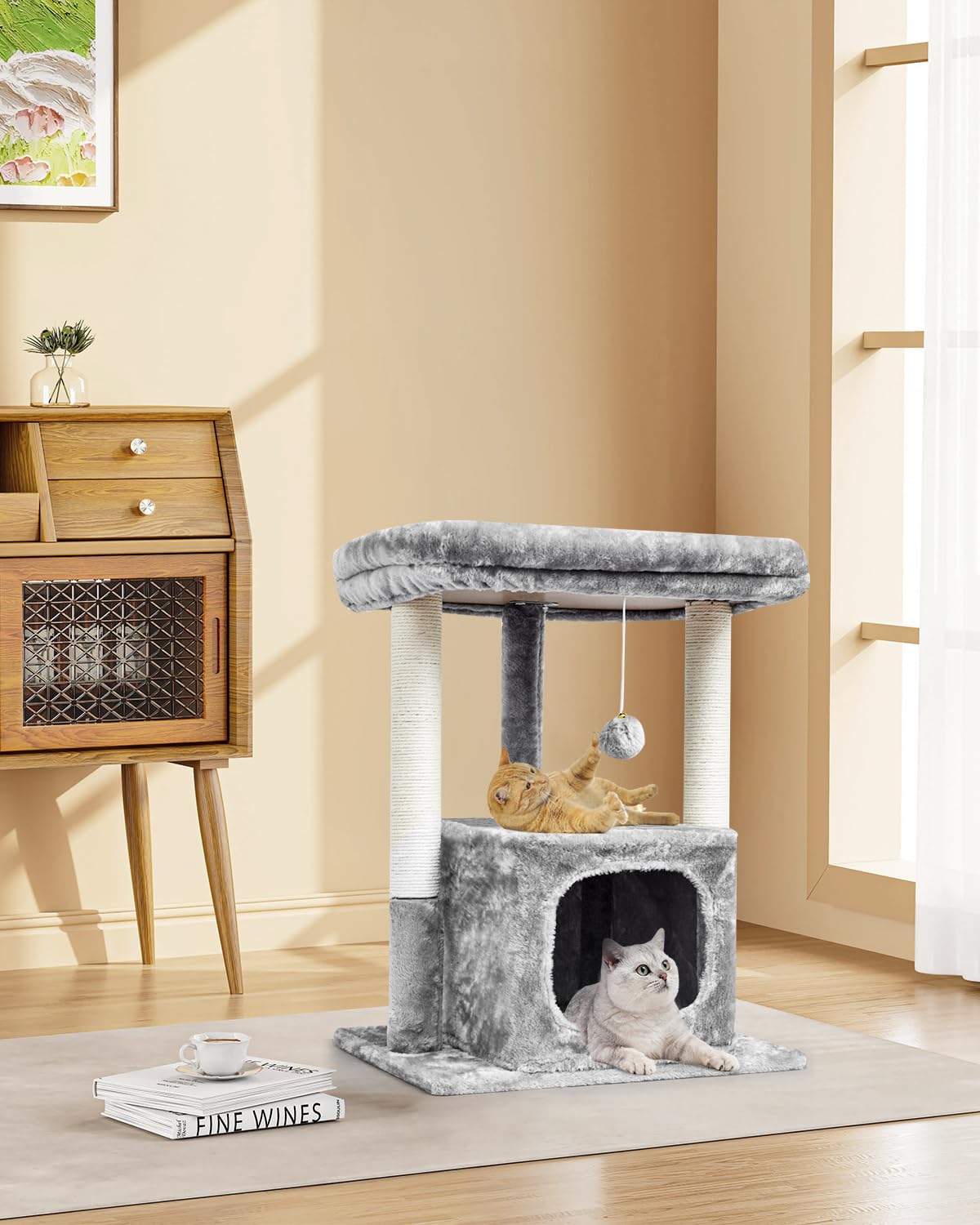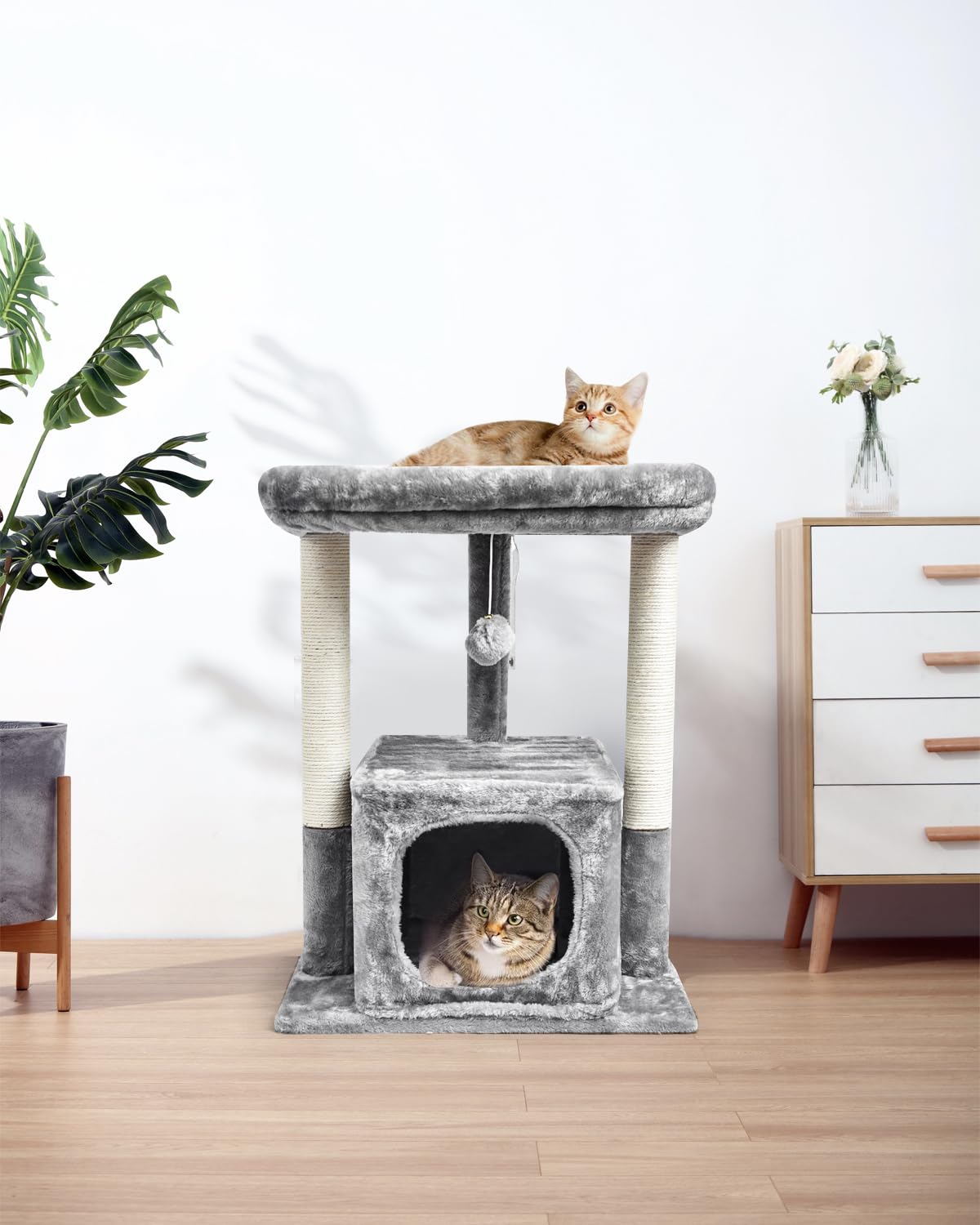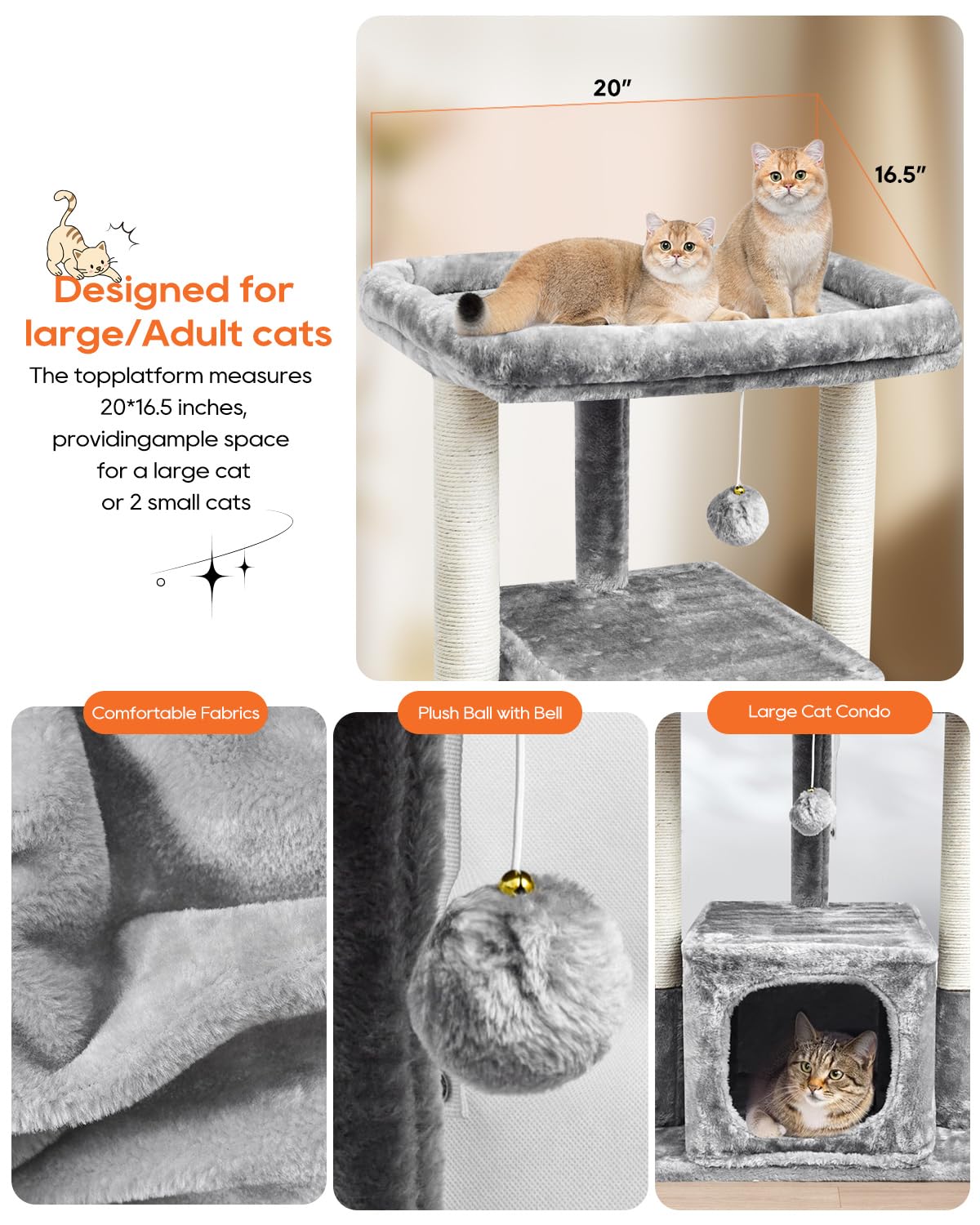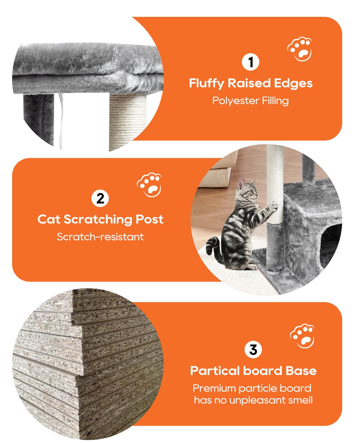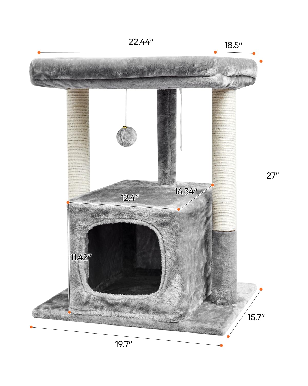 [EASY TO ASSEMBLE] This cat tower easy to put together with detailed graphic instructions. Overall dimension - 19.7” L x 15.7” W x 27”. This cat play tree in classic grey will decor your room as a piece of modern cat furniture