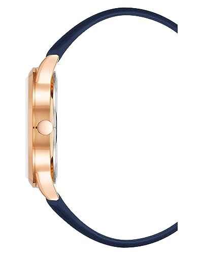 Navy blue sunray dial with white filled rose gold-tone hands and markers; white outer minute track