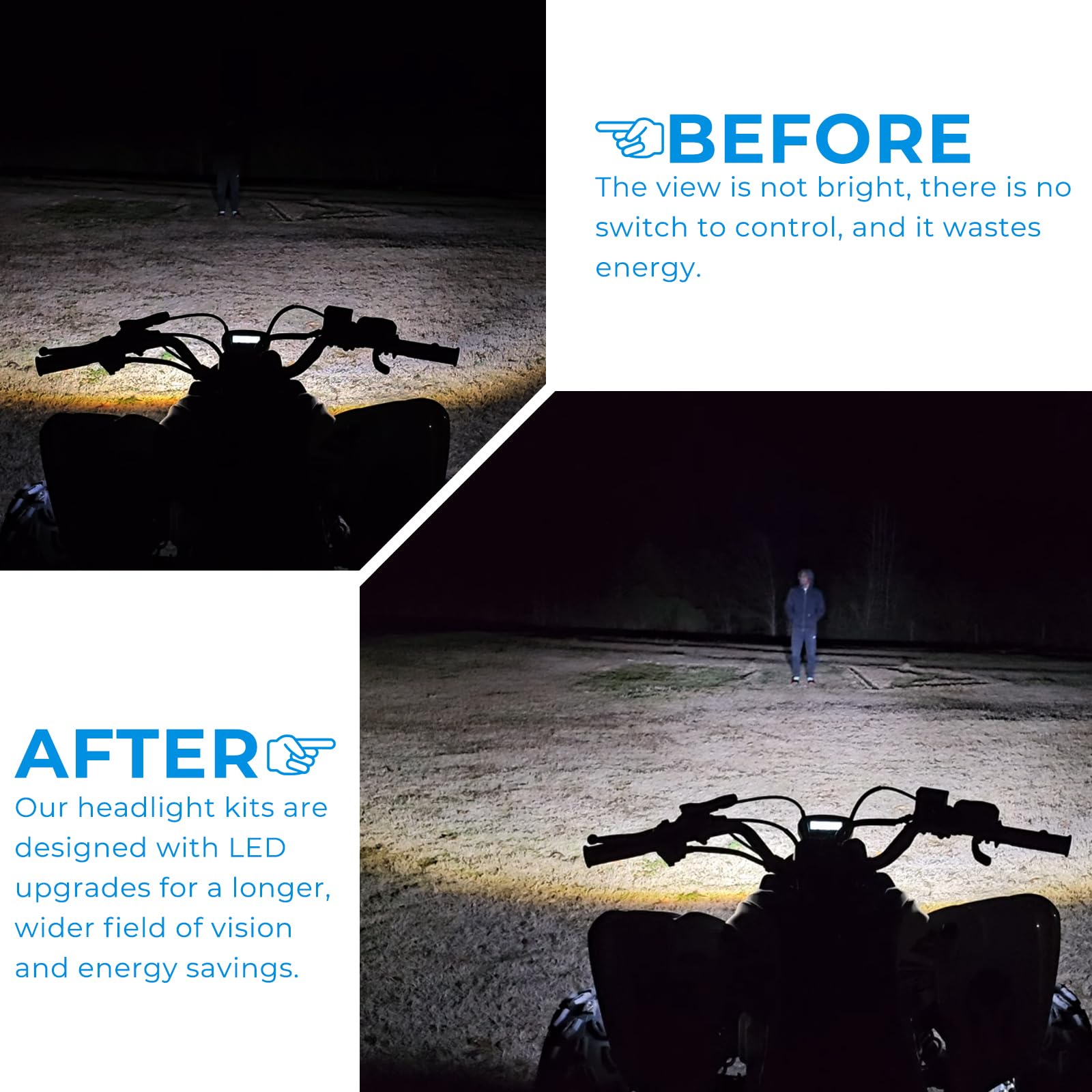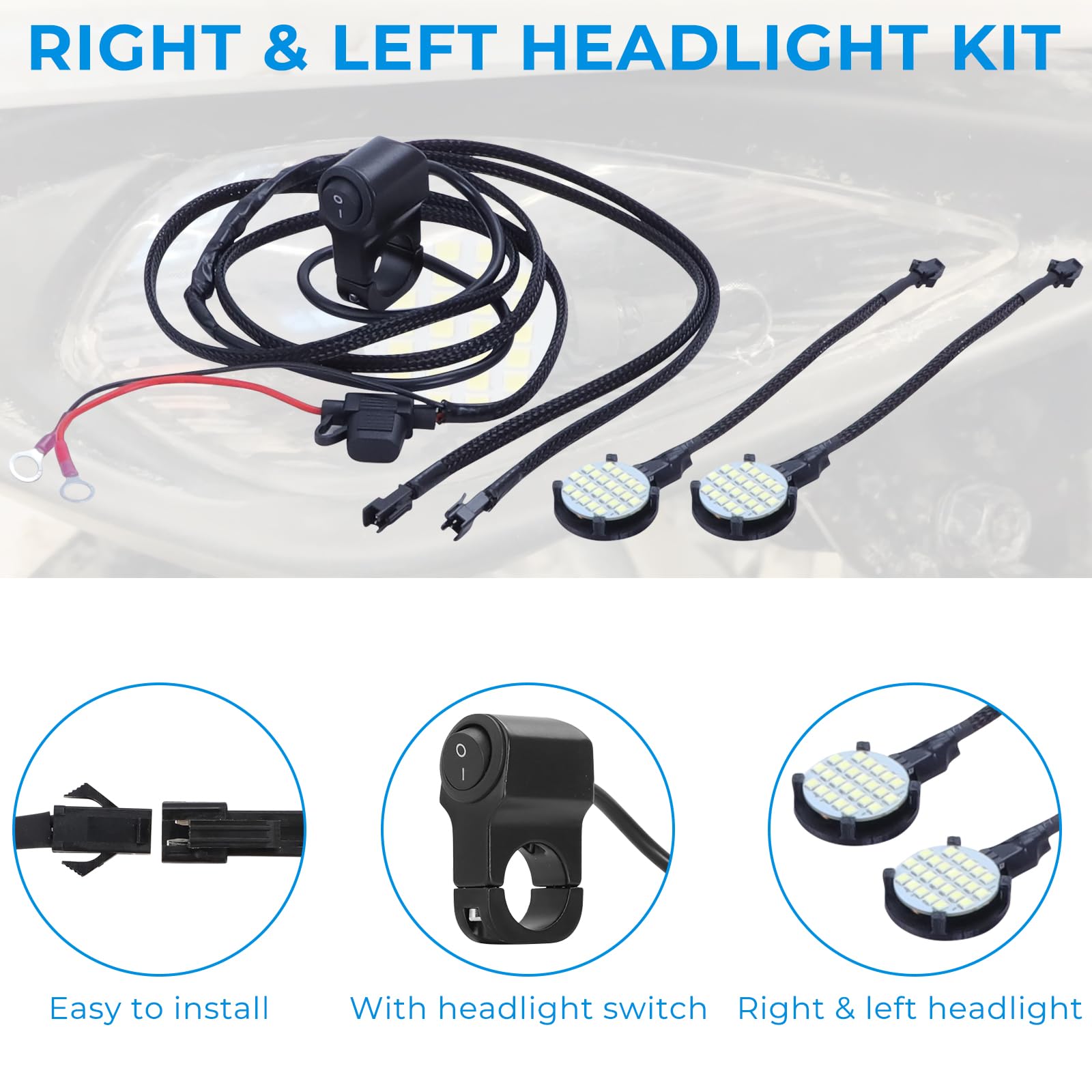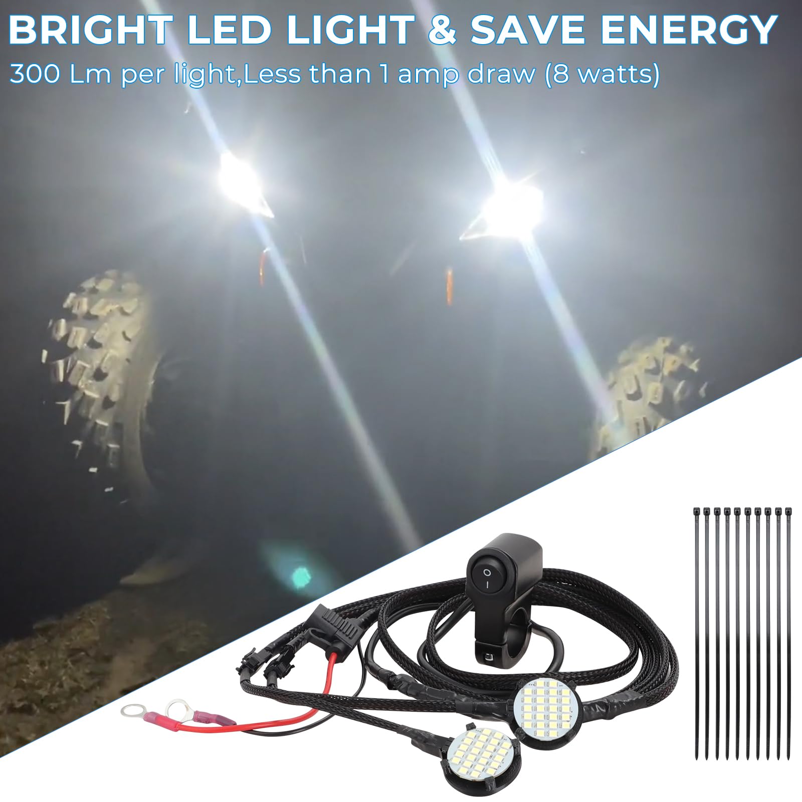 【Bright LED light】This headlight kit has 300 lumens per light and consuming less than 1 amp (8 watts),which is durable and energy efficient for a brighter riding experience while enhancing the look of your vehicle.