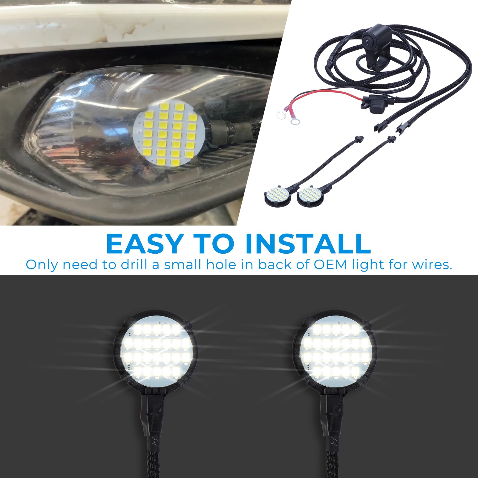 【Easy to install】Easy to install with a plug-and-play setup, complete with a switch wire harness for convenient control.Only need to drill a small hole in back of OEM light for wires.