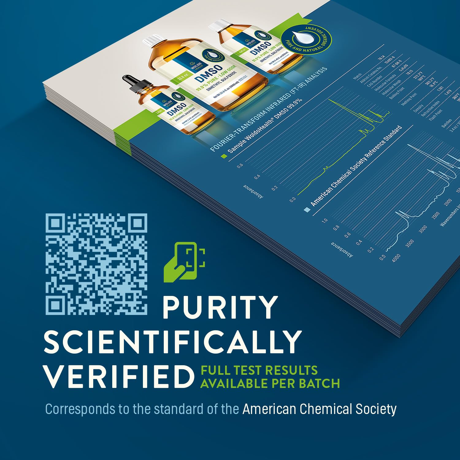 WoldoHealth DMSO 99.9% Pharmaceutical Grade purity, verified by FT-IR lab analysis and the ACS reference standard ensuring absolute transparency.