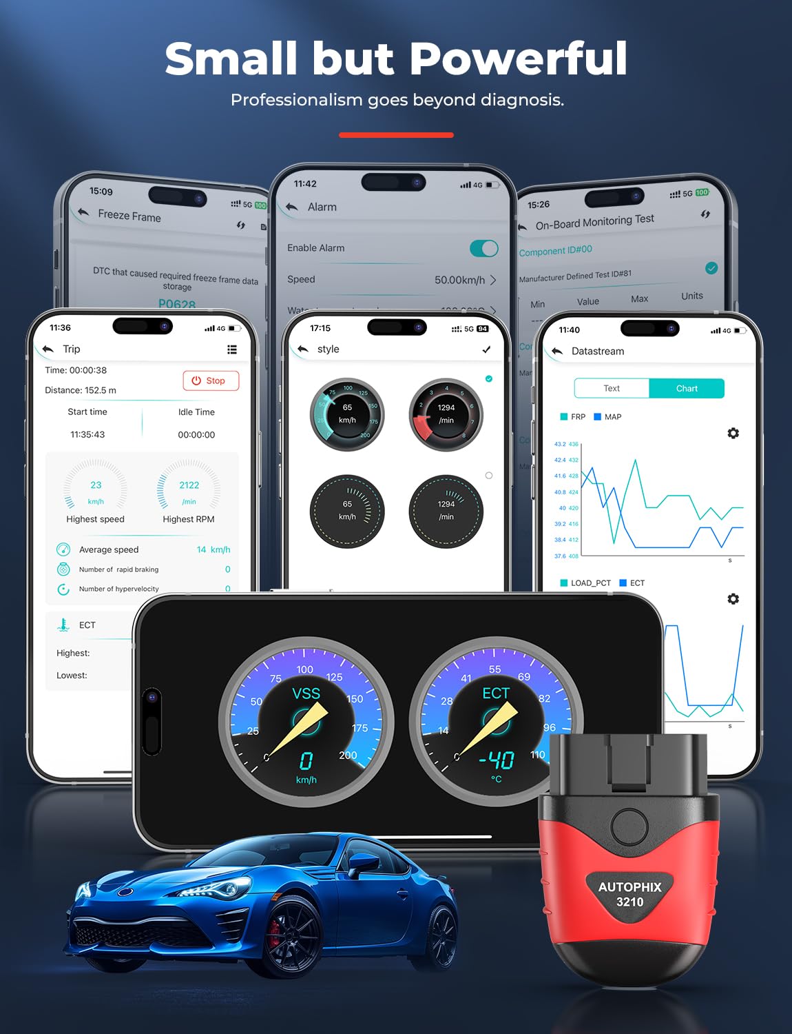 Unleash True Performance - Our OBD2 scan tool delivers pro-level performance testing, precisely tracking data like acceleration, distance, and braking. Visualize metrics in real time with PID charts for RPM, VSS and more – plus trip monitoring that analyzes speed changes, coolant temp, average speed, RPM, hard braking events, top speed, and idle time as you drive. Equipped with built-in alerts - speed warnings, coolant temp alarms, keep you focused and safe on every trip. No detail escapes this scanner – it's like having a pit crew for your car, minus the complexity.