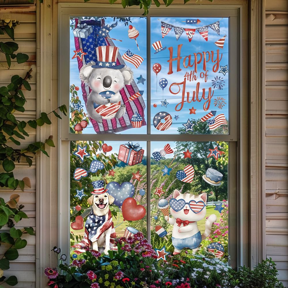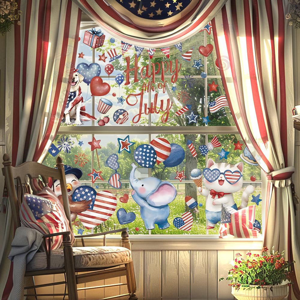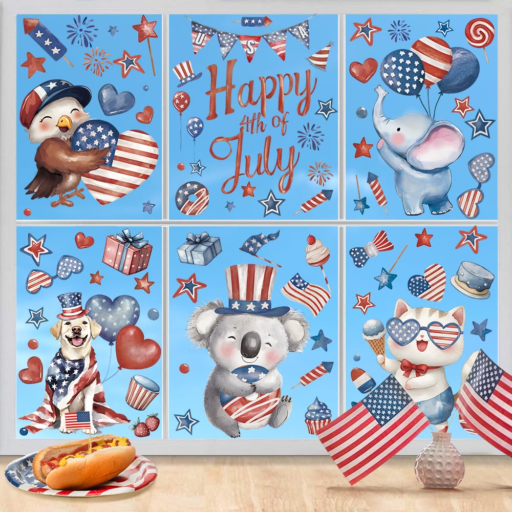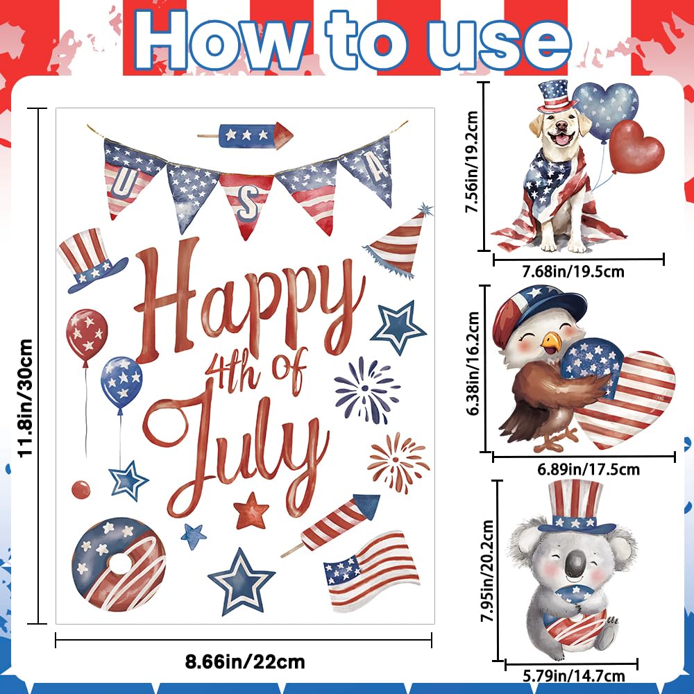Classic Independence Day Elements: You'll get 6 reusable Independence Day window stickers measuring 11.8x8.3 inches featuring classic Independence Day elements such as red and blue stars, fireworks, the Star-Spangled Banner, and cute critters along with the words “Happy 4th of July”. Easily creates a strong atmosphere of freedom