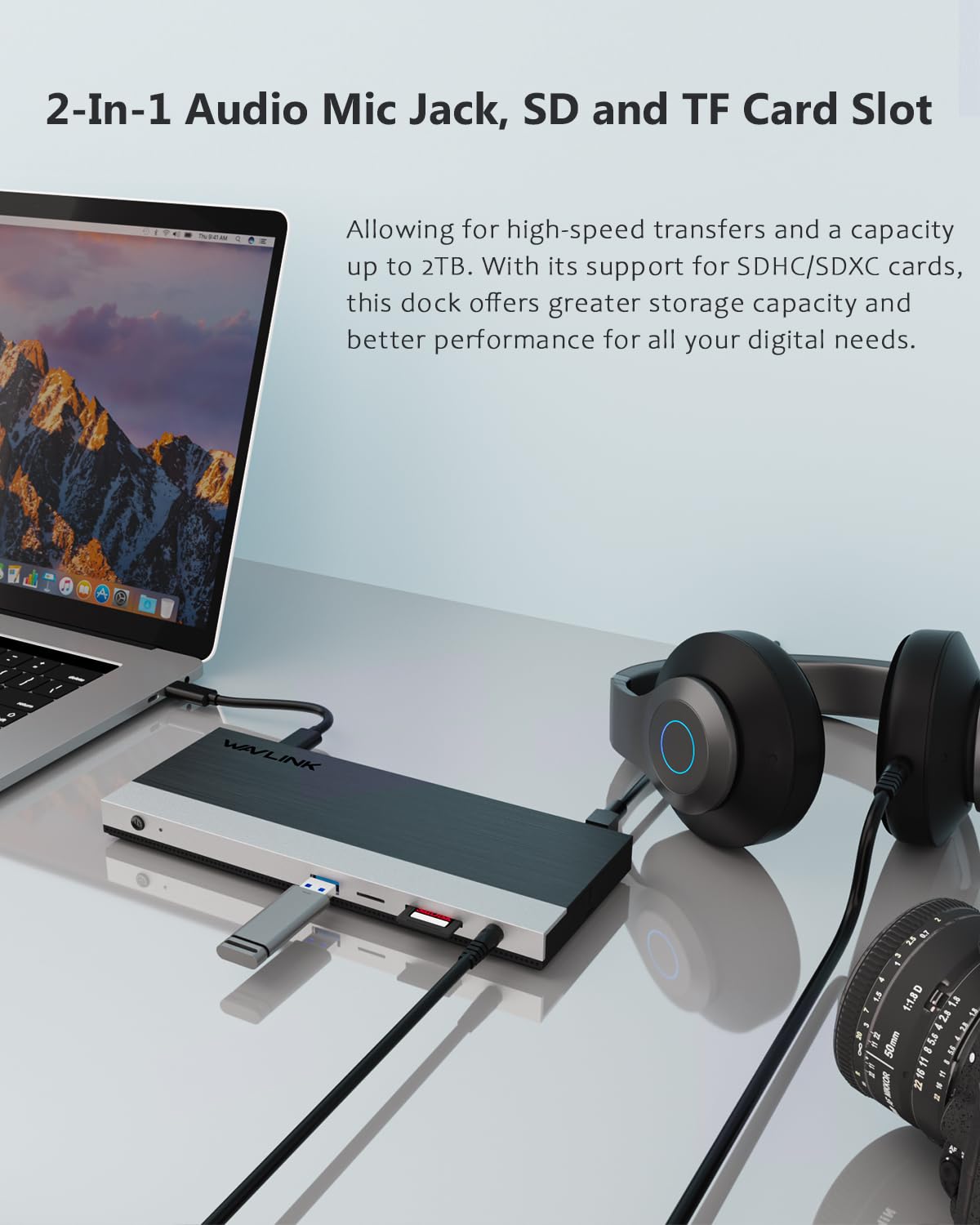 ⚡【4K Ultra HD Triple Display Dock】- 13 IN 1 USB C Docking Station with dual HDMI and 1 DisplayPort video ports. Depending on the laptop and its HBR3 DP1.4 source, you can achieve impressive resolutions: A single port supports video output up to 3840x2160@60Hz, dual displays up to 2560x1440@60Hz, and triple displays up to 1920x1080@60Hz. With HBR3 DP1.2, you can achieve a single display resolution of up to 3840x2160@30Hz or 2560x1440@60Hz, dual display resolution of up to 1920x1080@60Hz, and triple display resolution of up to 1600x900@60Hz. Enjoy crystal-clear visuals across multiple screens for enhanced productivity and immersive entertainment.