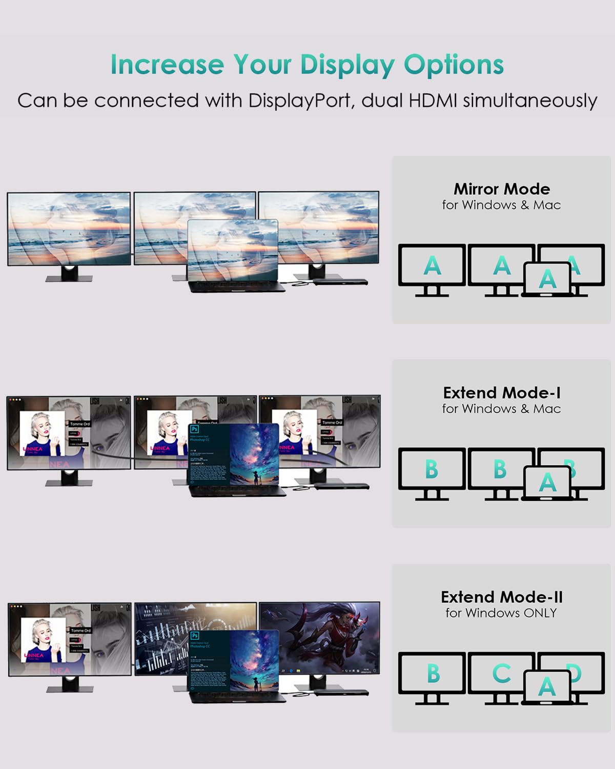 ⚡【Warm Tips Before Using On A Laptop System】Simply plug and play docking station- Mirror or extend your screen directly stream UHD(Ultra HD) video to HDTV, monitors, projectors. Windows system support MST and SST, triple display. Mac OS only support mirror mode and non-mirror mode without triple display. Non-mirror mode means that the two or three external monitors are same but different from laptop. Intel/M1/M2 based Mac only extend one monitor, the external monitors will show the same content.