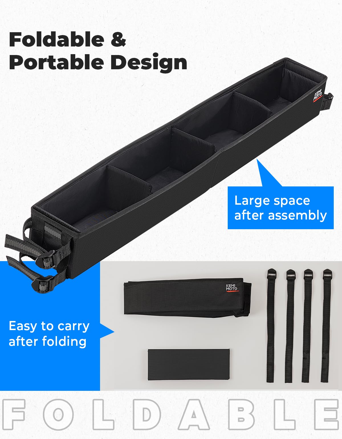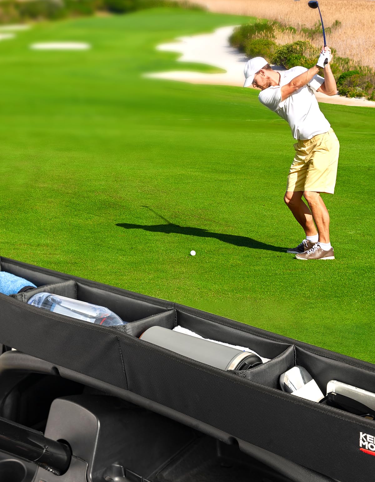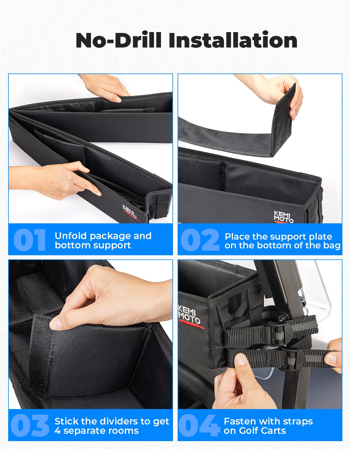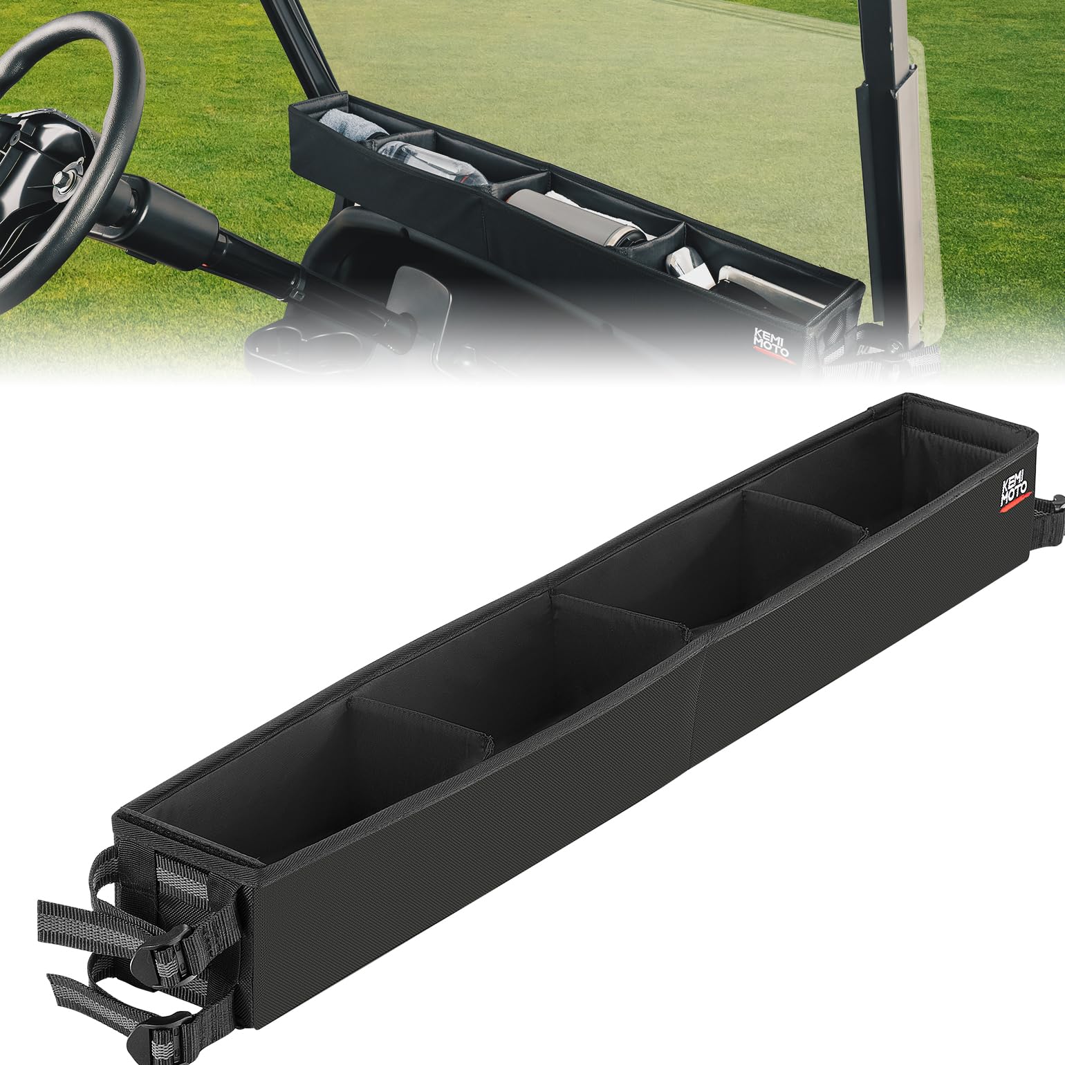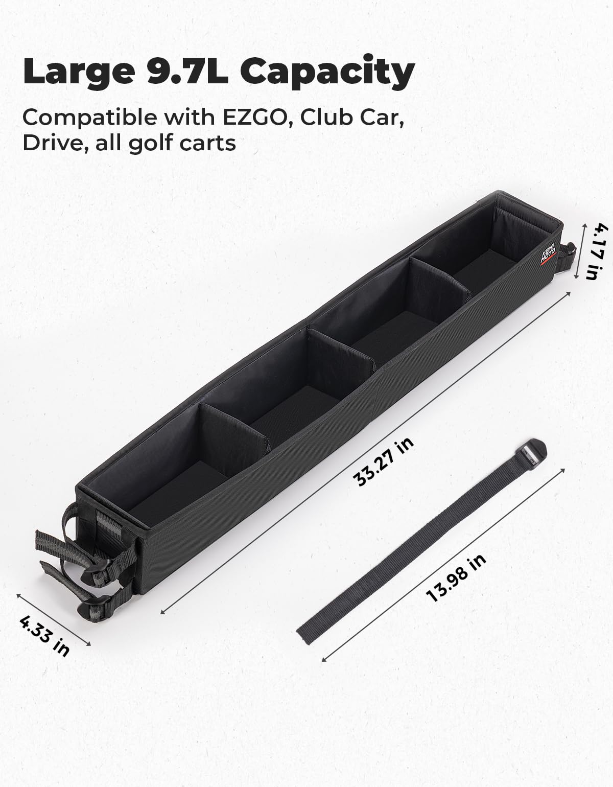 Extra Large Storage Space: Our golf cart inner organizer size is 33.27'' L x 4.33'' W x 4.17'' H. One-piece solid design with 9.7L Volume. The included square magic tape partition divides the box into four storage sections, each offering a generous 2.3L capacity