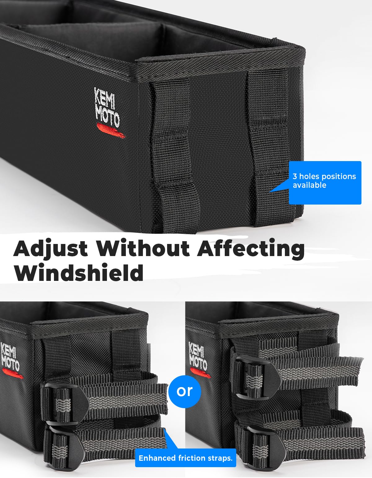 Easy Installation: No drilling is required. Use four non-slip straps to secure it. Both sides of the organizer tray provide 3 holes, matched with four enhanced friction surface straps to adjust the position of the storage box according to the windshield location