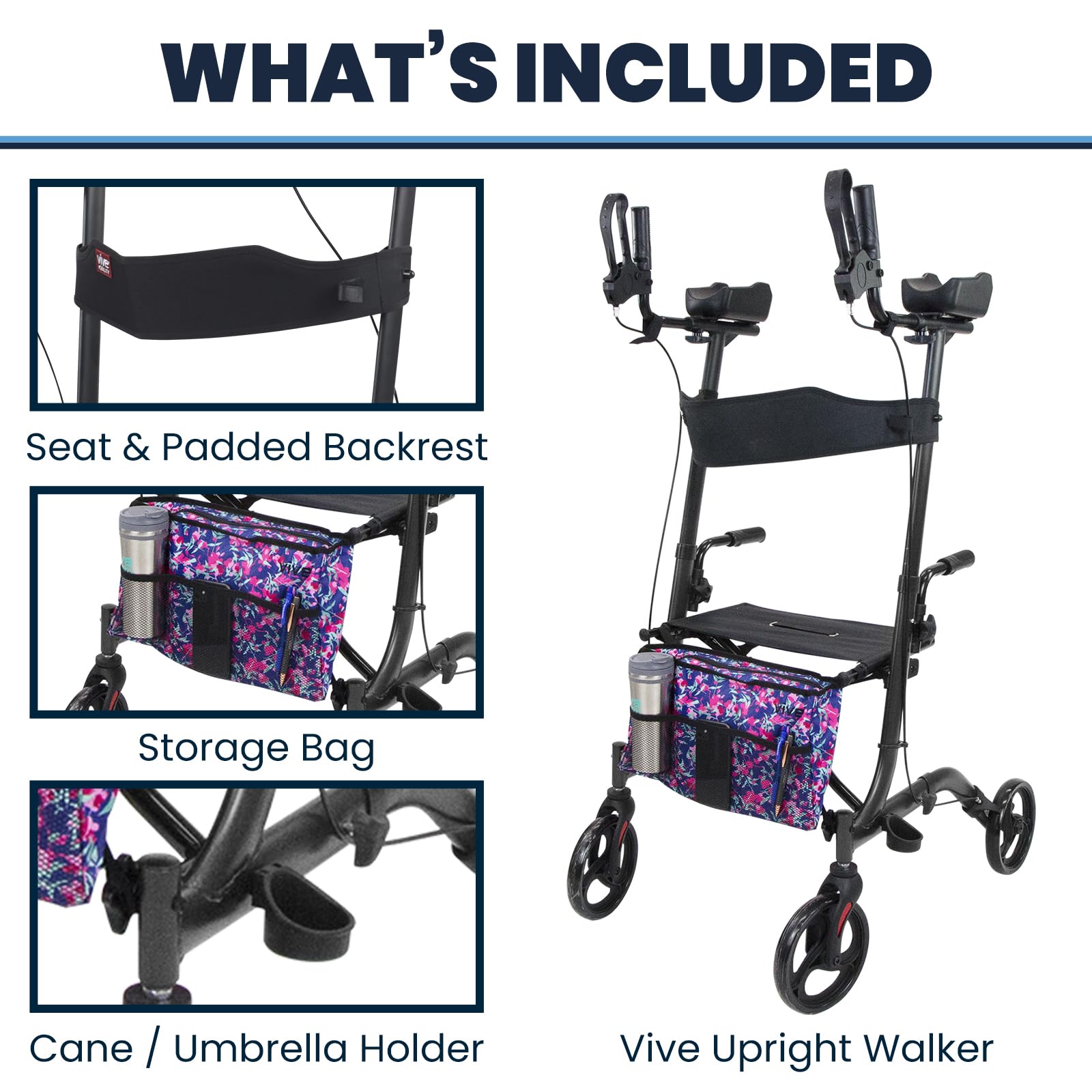SUPPORTS WALKING UPRIGHT ON ANY SURFACE: The Vive Upright Walker is a superior alternative to ordinary walkers. It can help improve your posture and confidence. It can also help reduce pain in your neck, hips, knees, hands, and wrists. The upright rollator walker features 8”, flat-free wheels for greater stability on many surfaces, and its forearm pads adjust forward and backward, better accommodating different arm lengths.