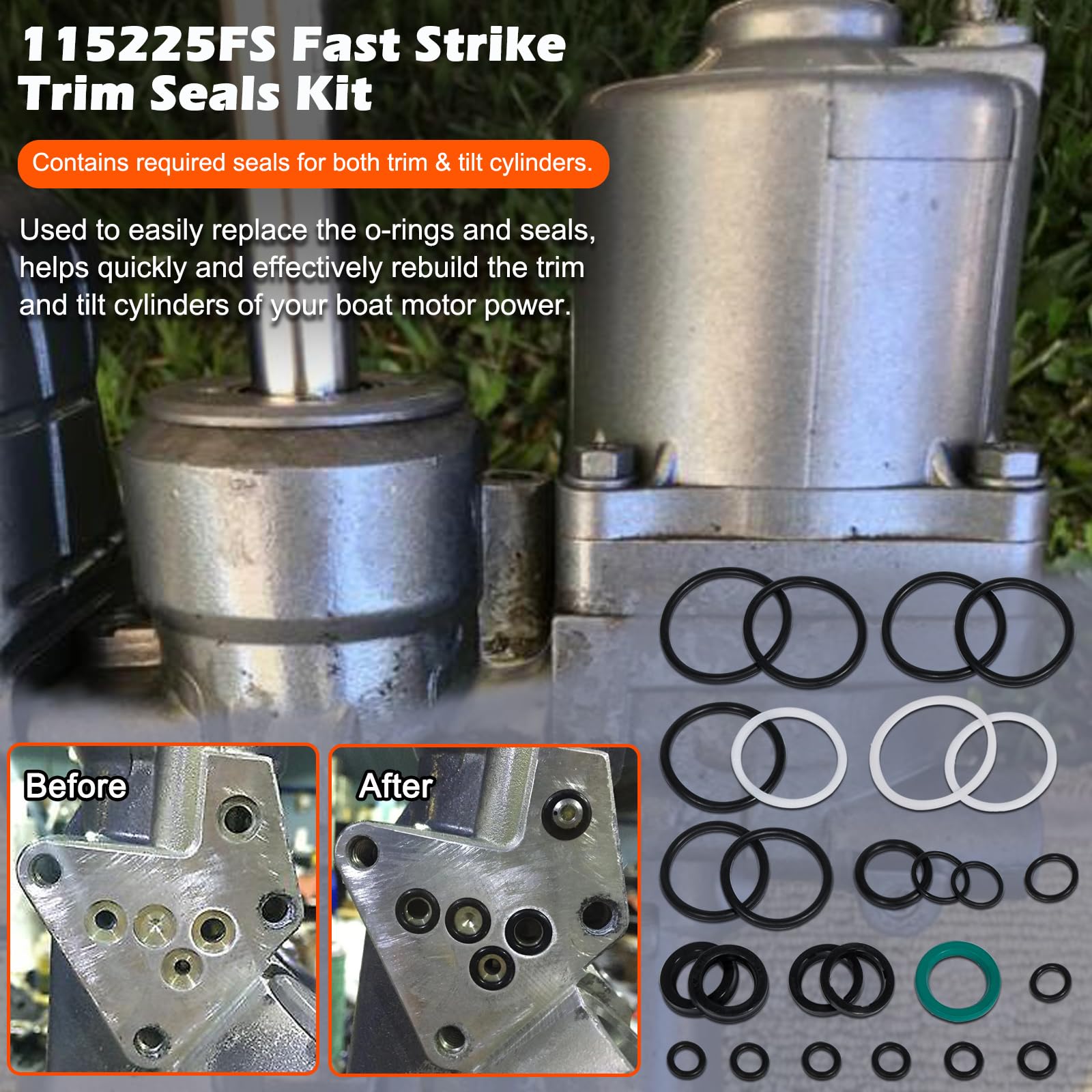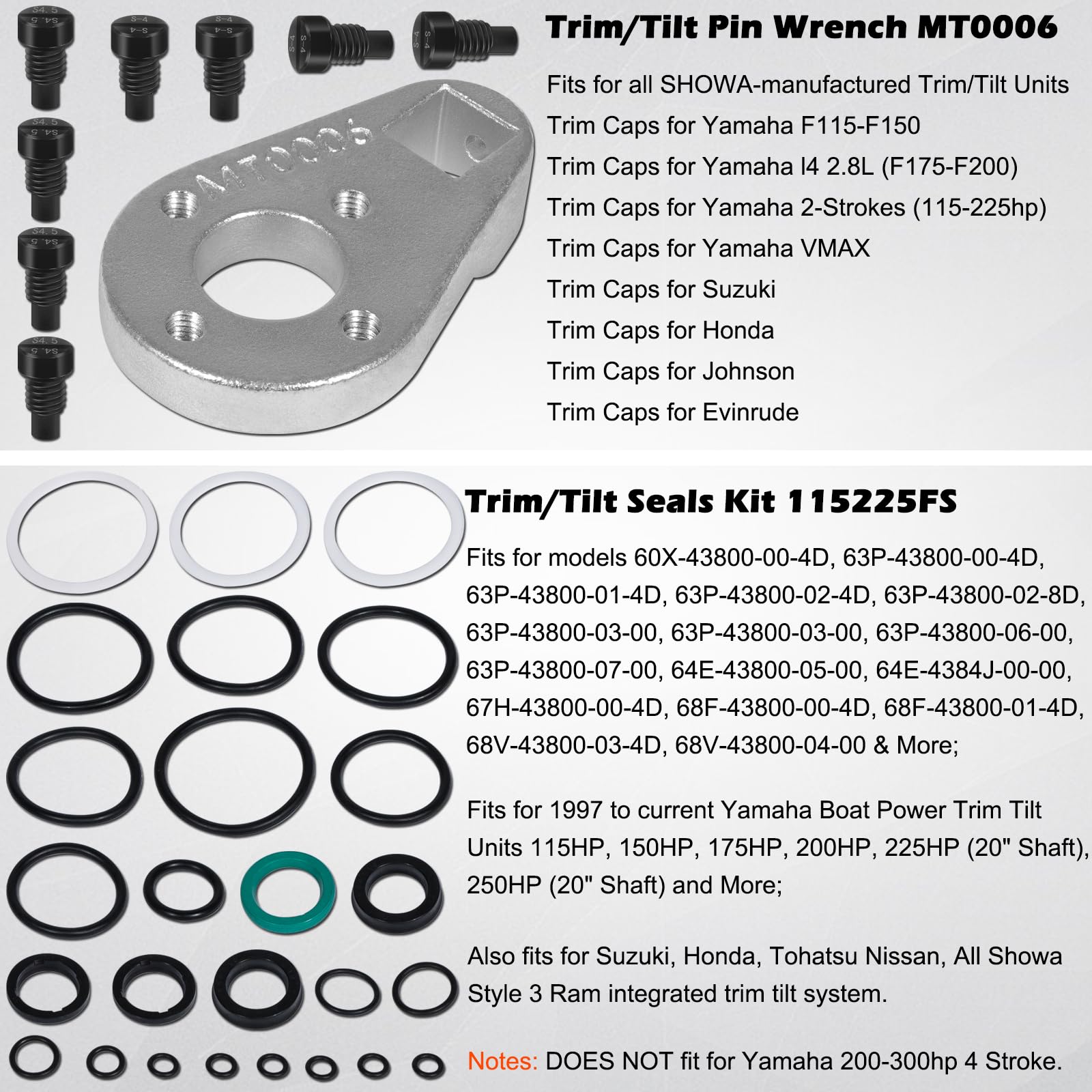 【115225FS Trim Tilt Seals Set】Fits for 1997 to current Yamaha Boat Power Trim Tilt Units 115HP, 150HP, 175HP, 200HP, 225HP (20" Shaft), 250HP (20" Shaft) and More; Also fits for Suzuki / Honda / Tohatsu Nissan / All Showa Style 3 Ram integrated trim tilt system. (Notes: DOES NOT fit for Yamaha 200-300hp 4 Stroke.)