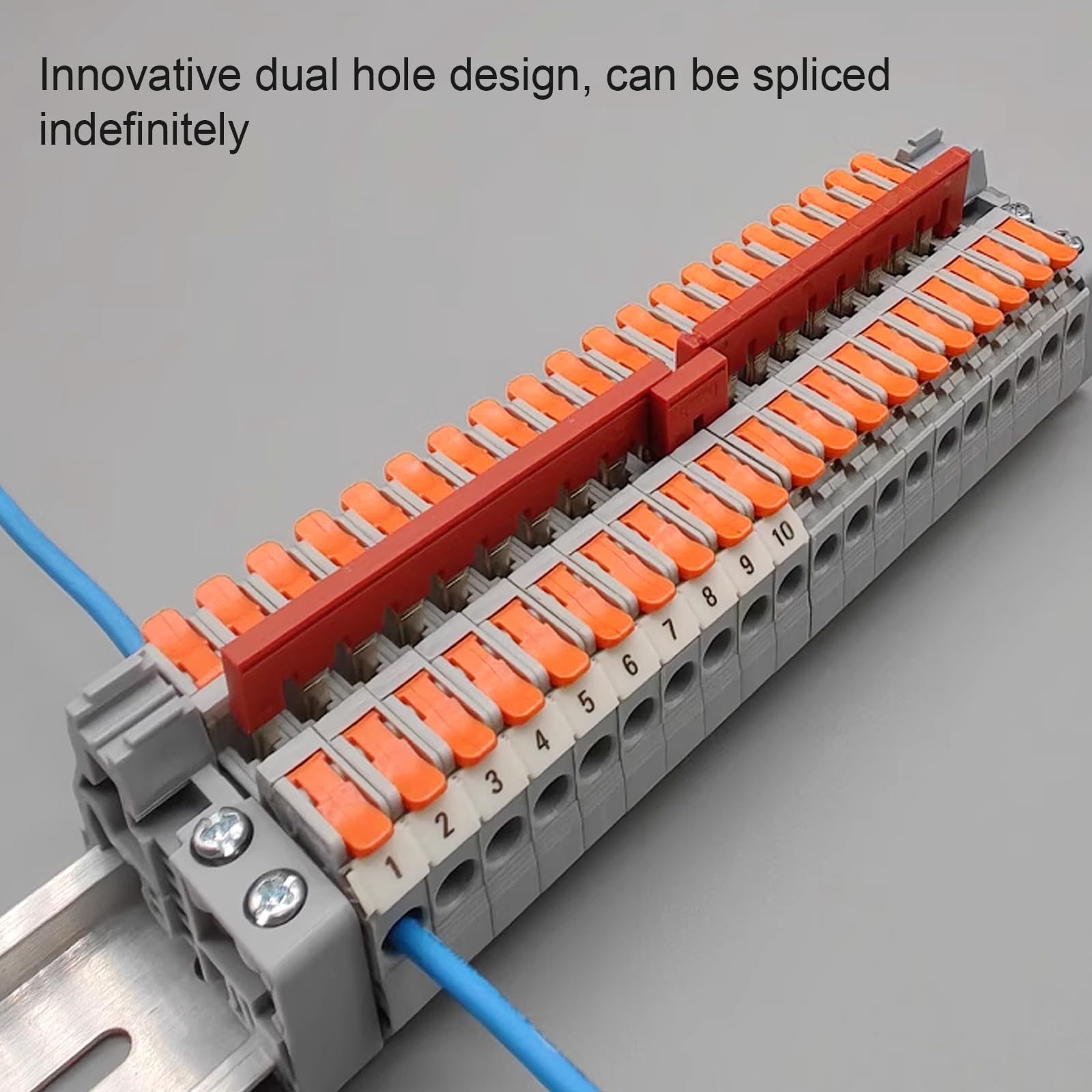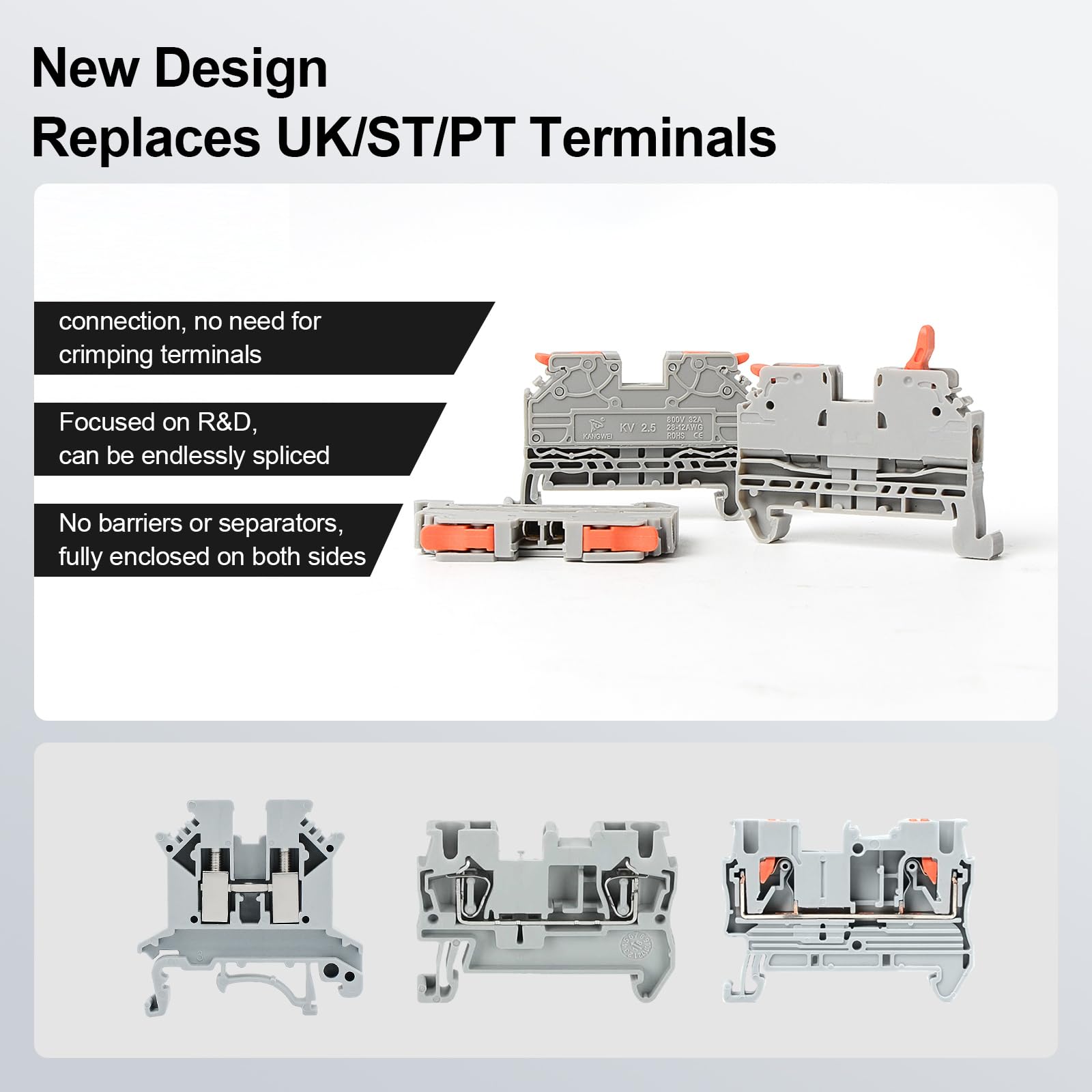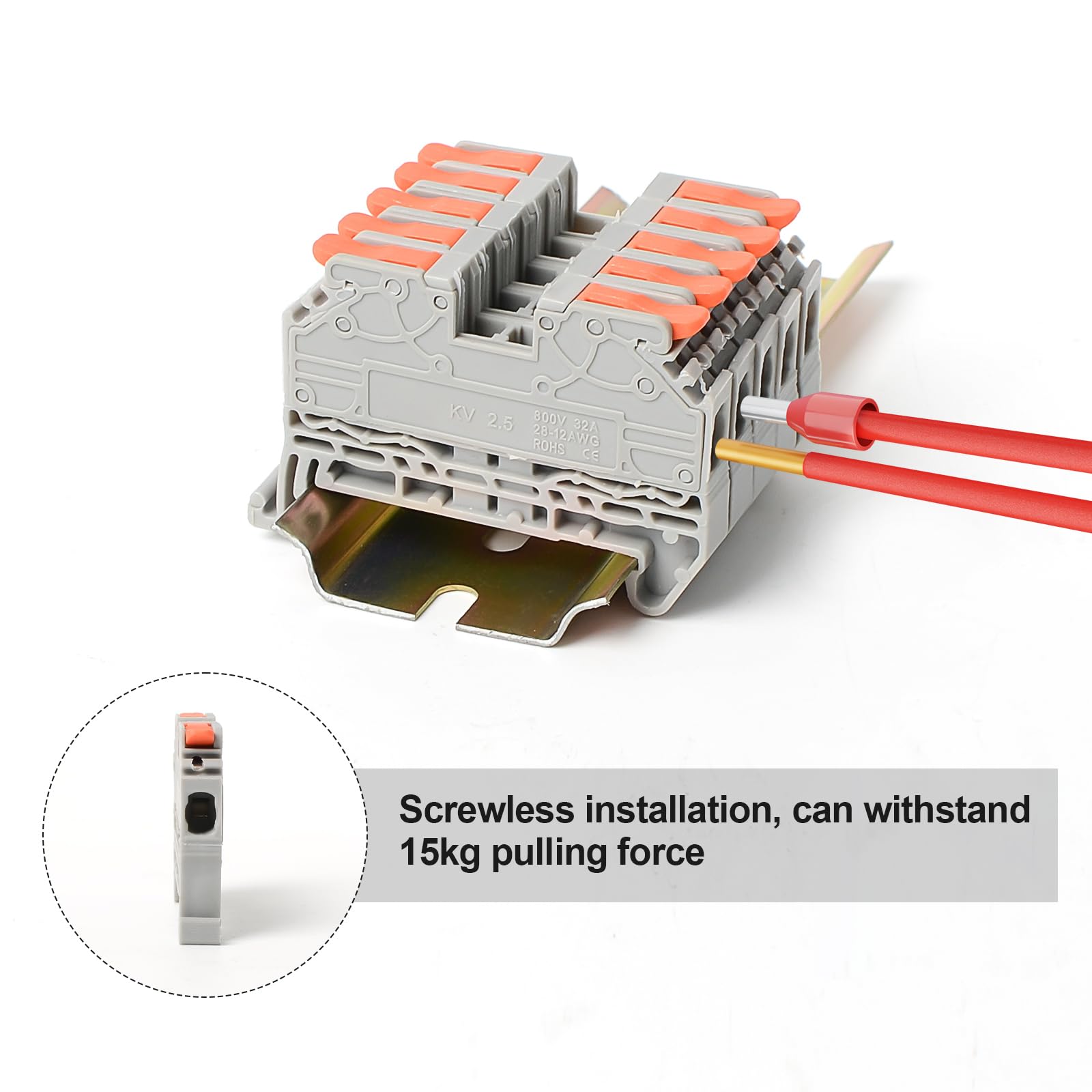 50Pcs KV2.5 Terminal Blocks, 28-12 AWG Compact Wire Conductor Connectors, DIN Rail Mounted, CE Certified Upgrade your electrical wiring with the GUETNEU 50Pcs KV2.5 Terminal Blocks, designed to deliver superior performance and safety in a variety of electrical applications. These compact and durable terminal blocks are perfect for use in industrial, residential, and commercial wiring systems. Key Features: High-Quality Construction Crafted from premium PA66 material, these terminal blocks provide excellent electrical insulation and exceptional heat resistance. Despite their lightweight design, they are built to withstand wear and aging, ensuring a longer service life. Safety First Featuring a V-0 flame retardant rating, these terminal blocks help prevent damage caused by electrical fires, offering you peace of mind and enhanced safety. CE and ROHS certifications confirm the product’s compliance with stringent international standards, ensuring both safety and environmental responsibility. Clear and Easy Identification The surface of each terminal block is clearly printed with essential details such as the model (KV2.5), voltage (800V), current (32A), and compatible wire gauge (28-12 AWG). This easy-to-read labeling helps you select the right terminal block for your specific needs. Versatile Applications Ideal for a wide range of electrical projects, these terminal blocks are commonly used in distribution panels, control systems, industrial automation, and household wiring. They are perfect for ensuring safe and reliable connections in power distribution systems, control boxes, frequency converters, and more. Whether you're working on industrial automation, home electrical installations, or appliance wiring, the GUETNEU KV2.5 Terminal Blocks offer a reliable, safe, and efficient solution for all your electrical needs. Get yours today for top-quality, secure connections!