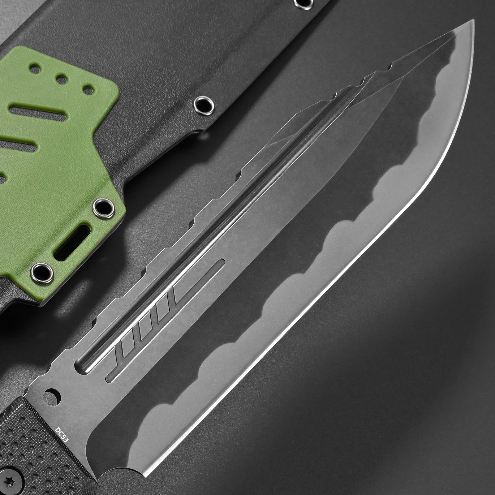 MASSIVE Two Tone DC53 Steel Hefty Blade: Blade made of DC53 stainless steel,hardness 59-61HRC,using black stone wash and Sandblasting process ,blade finish is pretty smooth and even,sturdy build Cool beefy blade , provides razor sharp for ultimate precision cutting performance and excellent edge retention.