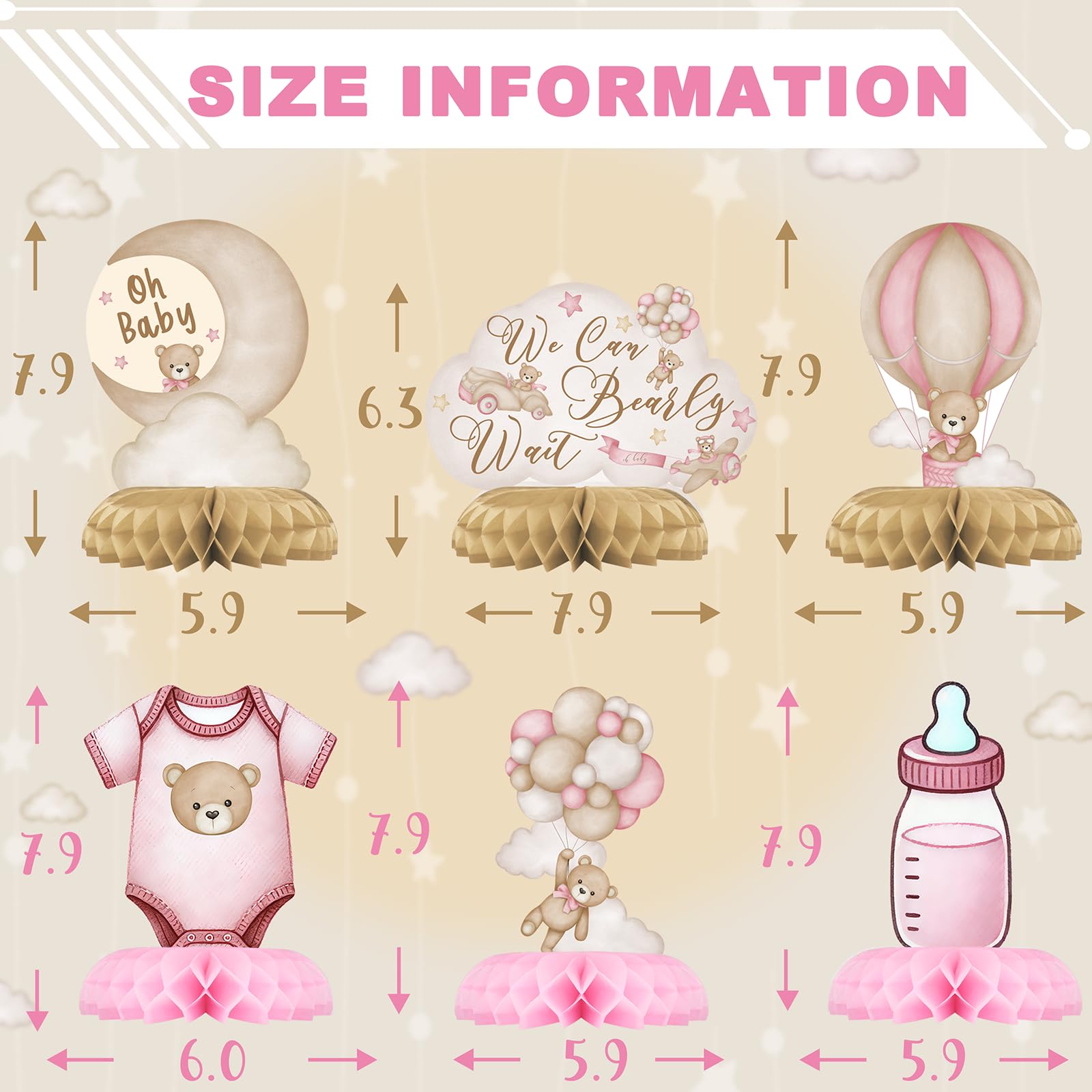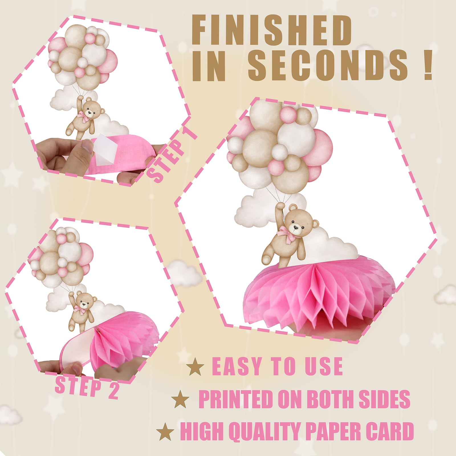 EASY TO ASSEMBLE: Set up your party in minutes with these simple-to-use pink teddy bear table toppers. Just attach the honeycomb to the card, fold out the feet of the little bears, and place them in your chosen display area. Decorating your party has never been easier or quicker!