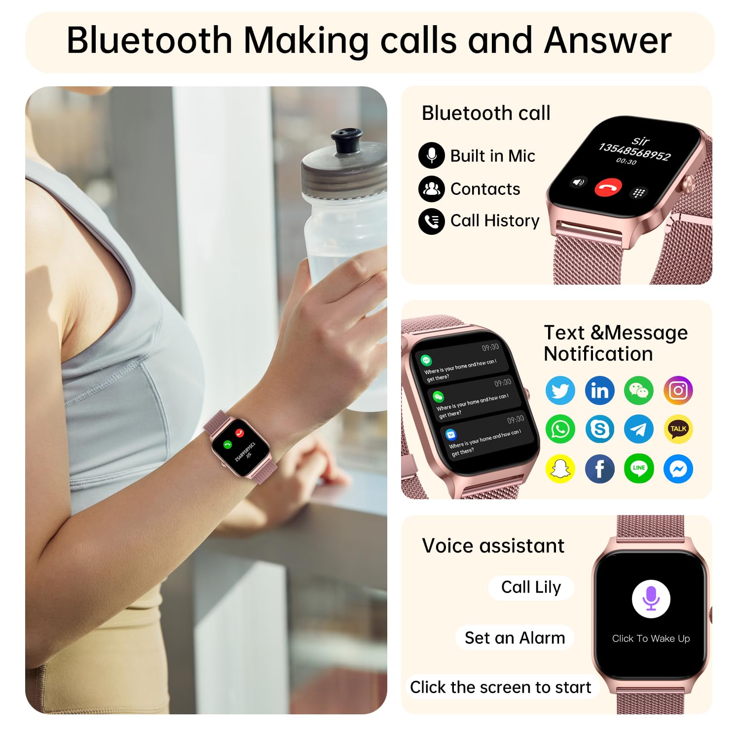 3 Watch Straps, 3 Wearing Styles: Digital watch women men adopts a larger screen design, and come with 3 watch bands to choose from - rose gold metal band is elegant and suitable for any daily occasion, and pink and black silicone bands are casual and suitable for matching sportswear.Smart watch for android phones contains many dials readily available to choose from along.You can DIY watch faces with your own photos.Smart watch for iphone compatible can be any photo,such as your family,pet,et